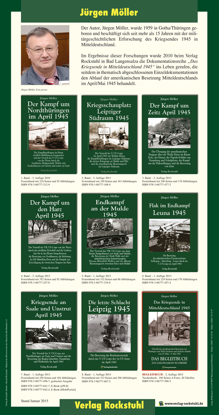 Der Autor, Jürgen Möller, wurde 1959 in Gotha/Thüringen geboren, ist verheiratet und lebt in Lauda-Königshofen / Baden-Württemberg. Neben seiner Tätigkeit als Offizier der Bundeswehr beschäftigt er sich seit mehr als zehn Jahren mit der militärgeschichtlichen Erforschung des Kriegsendes 1945 in Mitteldeutschland