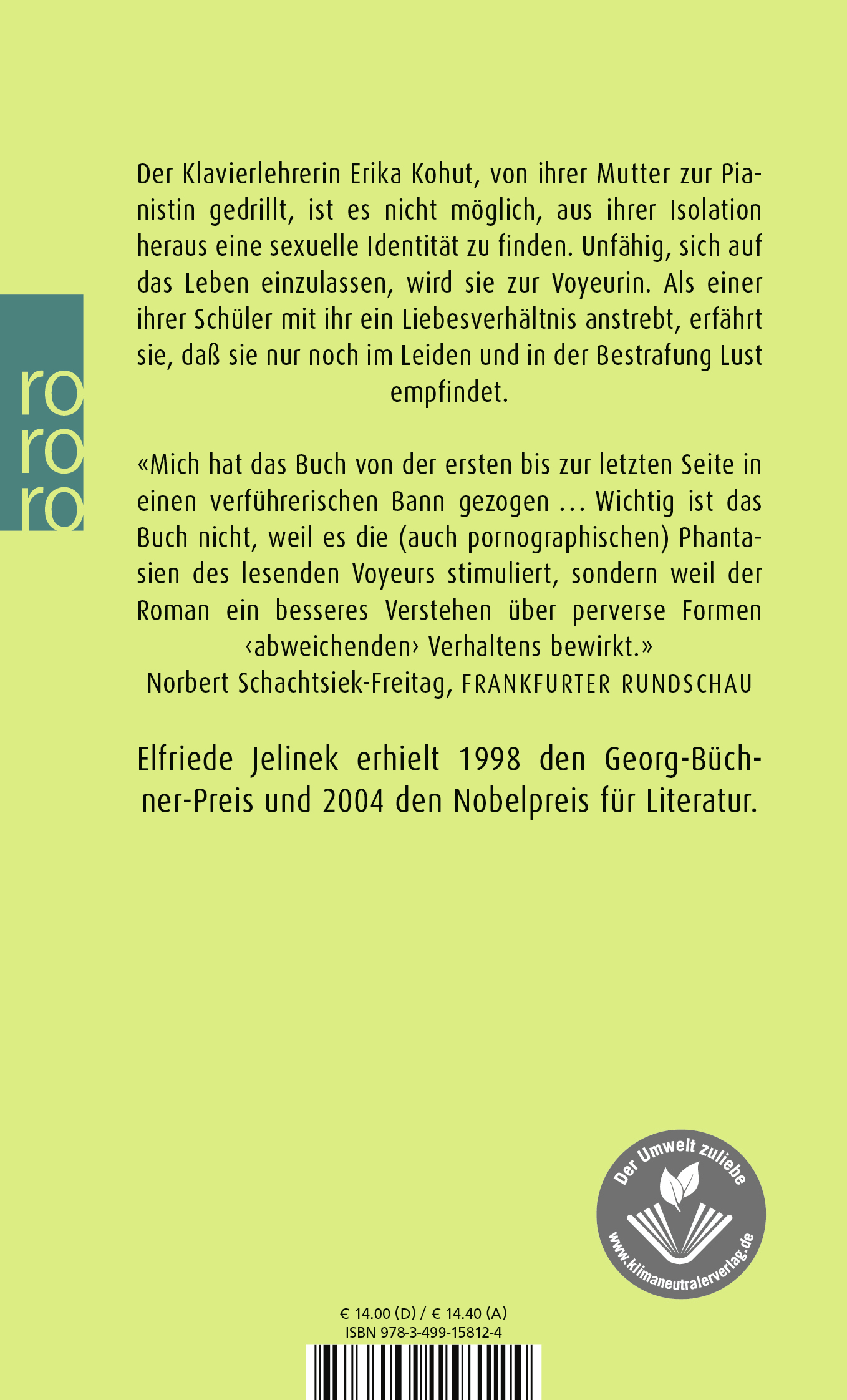| Schlagworte | Buchempfehlungen • Isolation • Junge Klassiker • Klavier • Liebesverhältnis • Literaturnobelpreis • Moderne Klassiker • Must-read Bücher • Mutter-Tochter Beziehung • Nobelpreis für Literatur • Romane über Musik • tiefgründige Romane • Voyeurismus • Weltliteratur • ZEIT-Bibliothek der Weltliteratur • Zeitgenössische Romane |