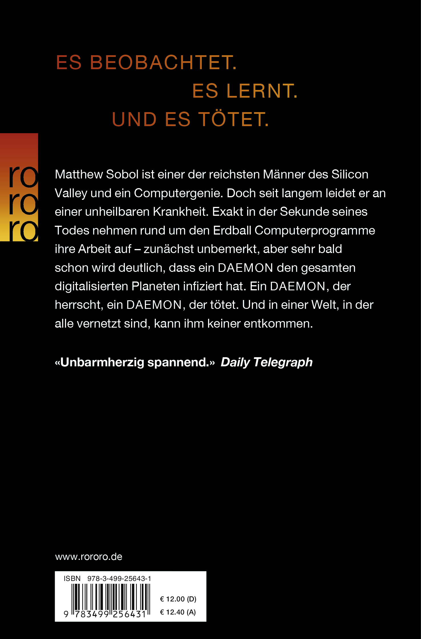 Matthew Sobol ist einer der reichsten Männer des Silicon Valley und ein Computergenie. Doch seit langem leidet er an einer unheilbaren Krankheit. Exakt in der Sekunde seines Todes nehmen rund um den Erdball Computerprogramme ihre Arbeit auf - zunächst unbemerkt, aber sehr bald schon wird deutlich, dass ein DAEMON den gesamten digitalisierten Planeten infiziert hat. Ein DAEMON, der herrscht, ein DAEMON, der tötet. Und in einer Welt, in der alle vernetzt sind, kann ihm keiner entkommen.