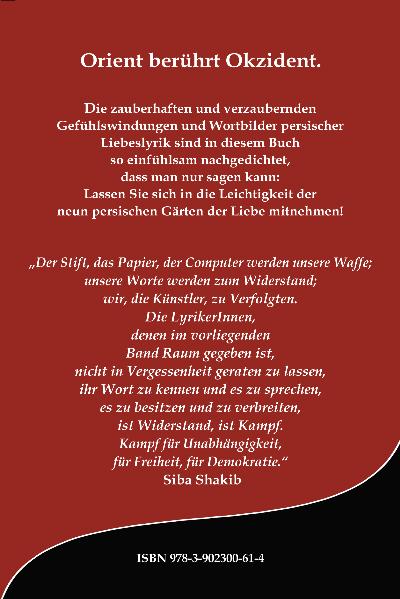 Orient berührt Okzident. So oft die alte persische Lyrik wie die Ghazelen (Liebesgedichte) von Hafis und Rumi oder die Rubais (Vierzeiler) von Khayam die großen deutschen Dichter und Philosophen des Westens inspiriert und vereinnahmt haben, so sehr sind die persischen Liebesgedichte der Gegenwart unentdeckt und unbeachtet. Ein Hauptgrund dafür liegt in fehlenden ambitionierten Nachdichtungen. Dieser Herausforderung stellten sich die HerausgeberInnen dieses Buch, sie wählten sorgfältig aus, übersetzten und dichteten nach, sodass hier nun persische, moderne Liebeslyrik solcherart vorliegt, dass LeserInnen die Verse im Spiegel eigener Sprache empfinden und genießen können.Die zauberhaften und verzaubernden Gefühlswindungen und Wortbilder persischer Liebeslyrik sind in diesem Buch so einfühlsam nachgedichtet, dass man nur sagen kann: Lassen Sie sich in die Leichtigkeit der neun persischen Gärten der Liebe mitnehmen! Der Stift, das Papier, der Computer werden unsere Waffe; unsere Worte werden zum Widerstand; wir, die Künstler, zu Verfolgten. Die LyrikerInnen, denen im vorliegenden Band Raum gegeben ist, nicht in Vergessenheit geraten zu lassen, ihr Wort zu kennen und es zu sprechen, es zu besitzen und zu verbreiten, ist Widerstand, ist Kampf. Kampf für Unabhängigkeit, für Freiheit, für Demonkratie. Siba Shakib