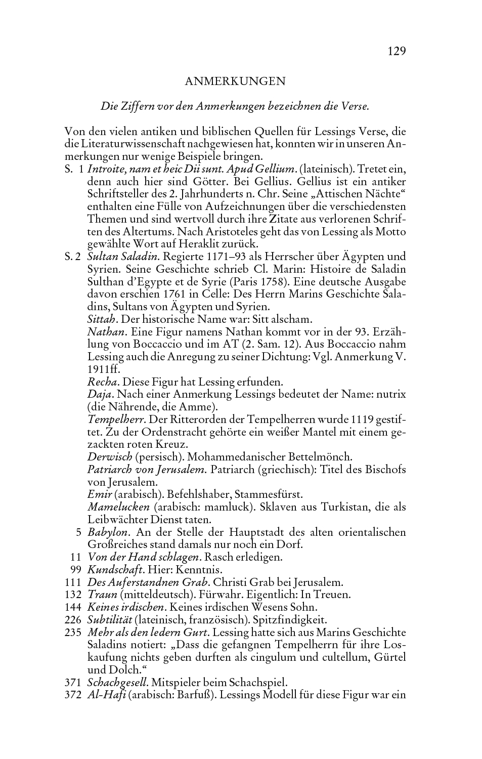 Kernstück dieser Dichtung ist die "Parabel von dem Ring", dessen Besitz den Erben der wahren Religion kenntlich machen soll. Lessing will im "Nathan" zeigen, dass "nicht die Wahrheit, in deren Besitz ein Mensch ist oder zu sein vermeint, sondern die aufrichtige Mühe, die er angewandt hat, hinter die Wahrheit zu kommen, den Wert des Menschen macht".Im Nachwort wird der "Nathan" literaturgeschichtlich eingegliedert und auf Textgeschichte und Textgestaltung eingegangen. Auf sieben Seiten werden schwierige Wörter erklärt.