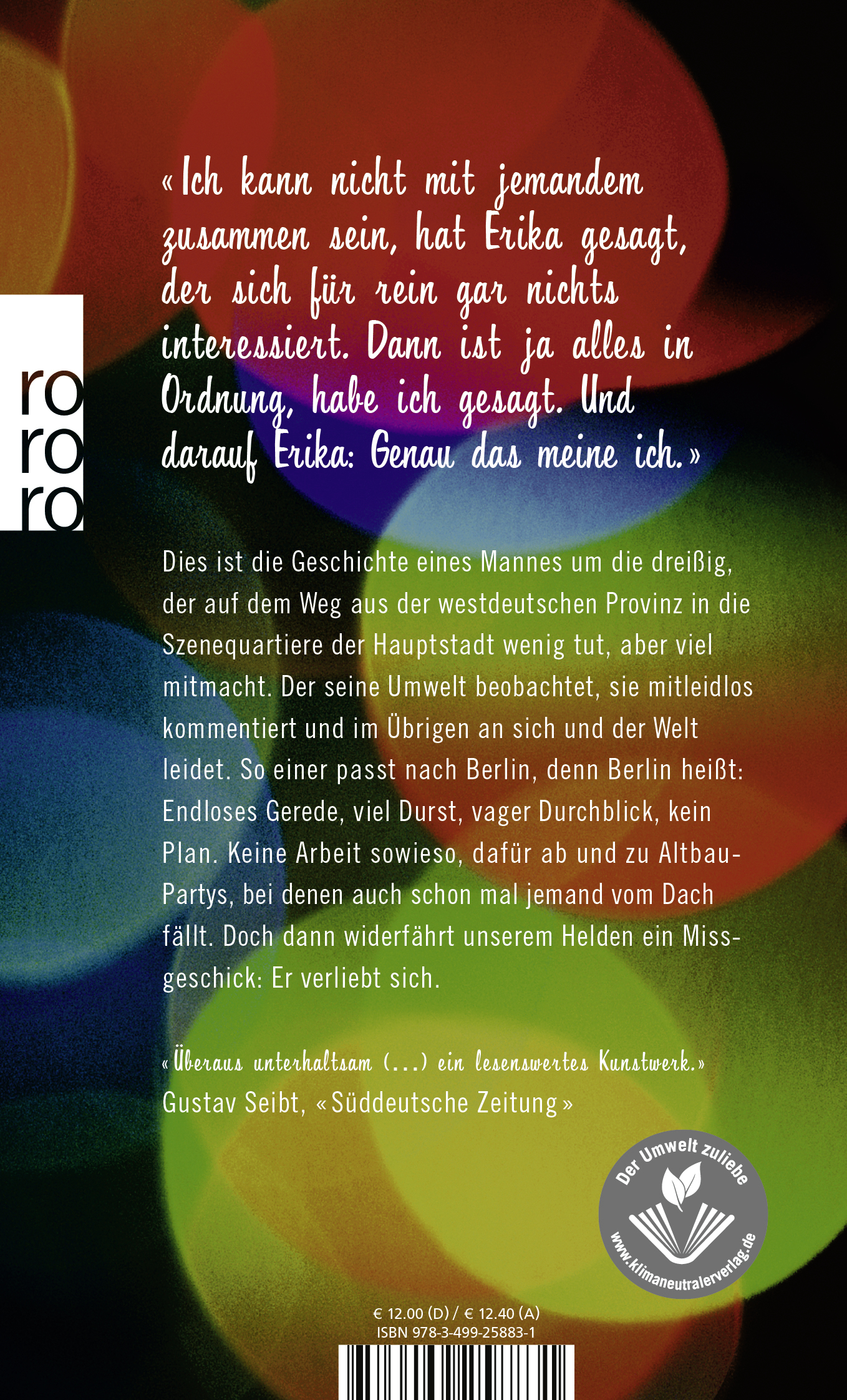 Dies ist die Geschichte eines Mannes um die dreißig, der auf dem Weg aus der westdeutschen Provinz in die Szenequartiere der Hauptstadt wenig tut, aber viel mitmacht. Der seine Umwelt beobachtet, sie mitleidlos kommentiert und im Übrigen an sich und der Welt leidet. So einer passt nach Berlin, denn Berlin heißt: Endloses Gerede, viel Durst, vager Durchblick, kein Plan. Keine Arbeit sowieso, dafür ab und zu Altbau-Partys, bei denen auch schon mal jemand vom Dach fällt. Doch dann widerfährt unserem Helden ein Missgeschick: Er verliebt sich.