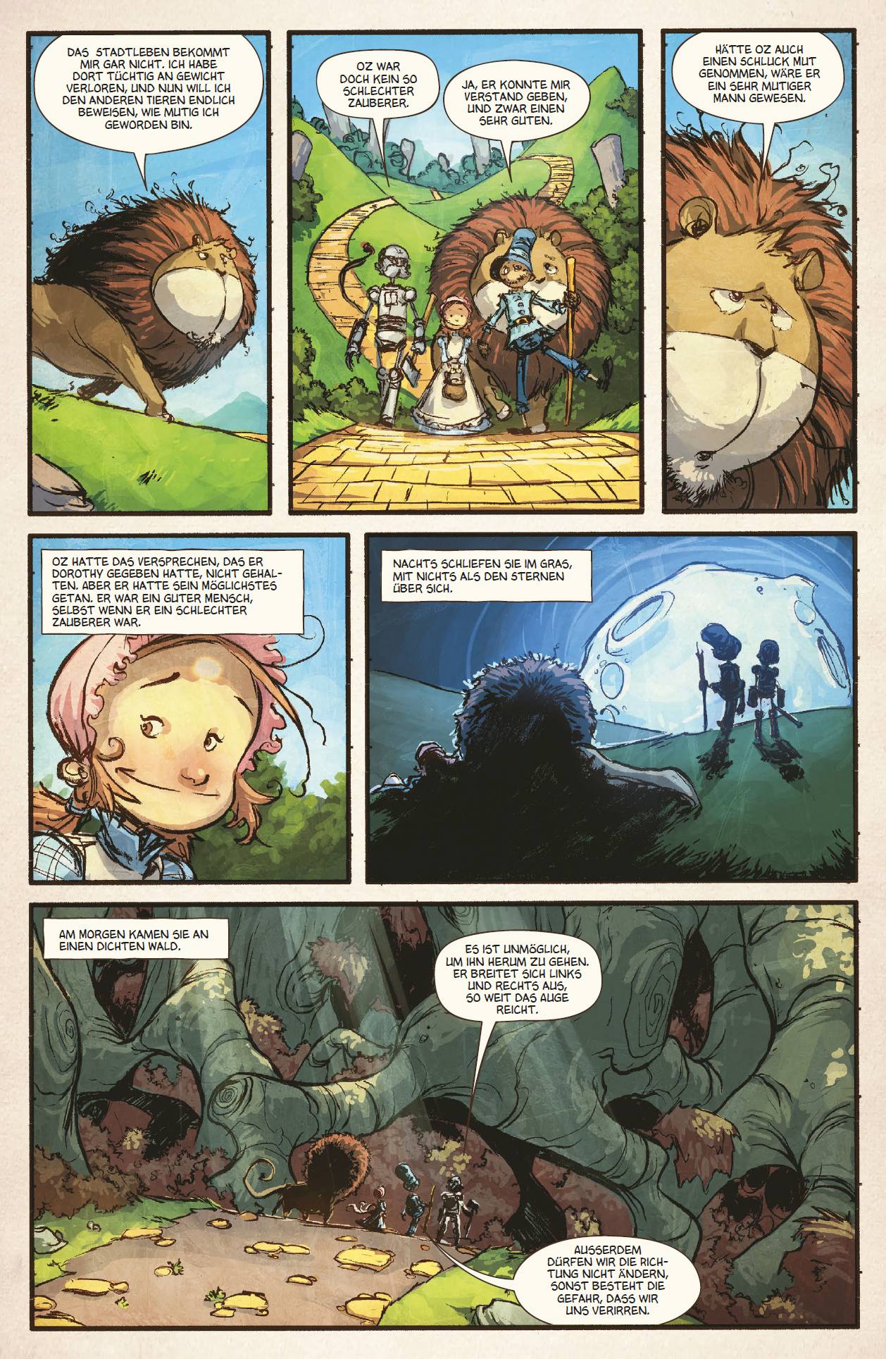 Ein hochwertiger, gebundener Band im Großformat sammelt die komplette Adaption des ersten "Oz"-Romans in Comicform. Mit einem umfangreichen Bonusteil mit vielen Skizzen und Erläuterungen, einem exklusiven Vorwort von Zeichner Skottie Young für die deutsche Ausgabe und einer Einführung von Alexander Bubenheimer, die nachfolgend ungekürzt wiedergegeben ist:Das smaragdgrüne Oz und seine deutschen LeserIn einer Zeitspanne von nur fünfzehn Jahren entstanden zum Ende des 19. Jahrhunderts zwei zeitlose Klassiker der Kinderliteratur, die bis heute den Kanon der amerikanischen Lieblingsbücher anführen: Huckleberry Finn von Mark Twain und Lyman Frank Baums Wizard of Oz. Beide haben mehr gemein, als es auf den ersten Blick scheint - hinter der Fassade des (kindgerechten) Abenteuers verbergen sich System- und Gesellschaftskritik, aber vor allem wurden sie von zahllosen Verlegern weltweit "noch kindgerechter" zurechtgestutzt und verstümmelt. Die Wiederentdeckung der originalen Texte lohnt sich ungemein, insbesondere beim Zauberer von Oz, auch um die im kollektiven Gedächtnis verankerten Bilder und Handlungsstränge zu ergänzen, für die Hollywood verantwortlich zeichnet, das in seinem goldensten Jahr 1939 einen grandiosen und mit zwei Oscars ausgezeichneten Musicalfilm mit Judy Garland auf die Leinwände schickte (über den Flop von Diana Ross und Michael Jackson Jahrzehnte später sollte dagegen besser der Mantel des Schweigens gebreitet werden). Interessant ist aber auch der Unterschied in Themen, Sprache und Gesellschaftsdenken zum anderen großen eskapistischen Kinderklassikers jener Tage, des fünfunddreißig Jahre älteren Alice im Wunderland. Die Unterschiede zwischen britischer und amerikanischer Mentalität sind kaum einfacher herauszustellen als im direkten Vergleich dieser Werke aus der oberen britischen Mittelschicht und dem bodenständigen amerikanischen Urvertrauen in die eigene Schaffenskraft.Der Zauberer von Oz (The Wonderful Wizard of Oz) wurde 1900 von L. Frank Baum geschrieben und graphisch von W.W.Denslow ergänzt, dessen herausragende Illustrationen auch heute noch wunderschön anzuschauen sind. Die Popularität von Dorothy, dem kleinen Mädchen aus Kansas, das im fremden Land Oz mit der Vogelscheuche ohne Verstand, dem Blechmann ohne Herz und dem feigen Löwen ein fantastisches Abenteuer erlebt und die böse Hexe des Westens besiegen muß, um vom mächtigen Zauberer Oz Hilfe für den Heimweg zu bekommen, kannte schnell keine Grenzen mehr. Baum selbst schrieb zwei Jahre später eine musikalische Bühnenfassung, die zuerst am Broadway und dann im ganzen Land ein sensationeller Erfolg wurde. An eine Fortsetzung des Romans hatte er allerdings nicht gedacht, doch die überwältigende Resonanz von Kindern aus dem ganzen Land, die ihn mit Bittbriefen überschütteten, sorgte letztlich für ein Umdenken Baums. Zuerst kehrte er 1904 mit Das erstaunliche Land Oz (The Marvelous Land of Oz) nach Oz zurück, ab 1907 folgte dann fast jährlich bis zu seinem Tod Roman auf Roman, insgesamt vierzehn an der Zahl (aufgrund des Zerwürfnisses zwischen Baum und Denslow alle solide illustriert von John R.Neill). Nach seinem Tod 1919 beauftragte der amerikanische Verleger die Autorin Ruth Plumly Thompson, die Oz-Reihe fortzuführen. In der bewährten Unterstützung des Illustrators Neill schuf Thompson im jährlichen Rhythmus weitere neunzehn Romane. Neill selbst verfasste dann drei zusätzliche Romane, gefolgt von anderen Autoren. Wie sehr Oz auch heute noch smaragden schimmert, zeigt der Erfolg der "Wicked"-Romane und des gleichnamigen Musicals, nun gänzlich an ein erwachsenes Publikum gerichtet.Während in Amerika jedes Kind Oz und seine Charaktere kennt, ist hierzulande die Oz-Welt im Vergleich beispielsweise zu Mark Twain fast nur über die musikalischen Versionen (des Films von 1939 als auch der aktuellen Musicals) verbreitet. Bezeichnend ist, dass gerade einmal sieben (!) Romane den Weg in die deutsche Sprache fanden - bei verschiedenen Verlagen, über die lange