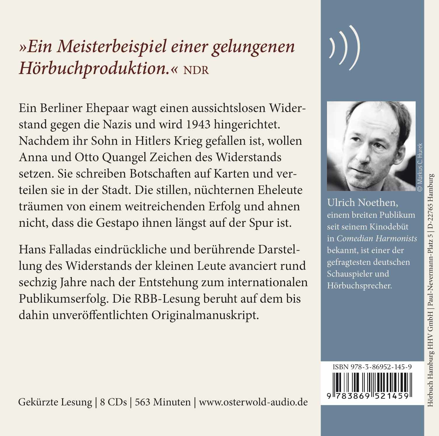 Ein Berliner Ehepaar wagte einen aussichtslosen Widerstand gegen die Nazis und wurde 1943 hingerichtet. Von ihrem Schicksal erfuhr Hans Fallada aus einer Gestapo-Akte, die ihm durch Johannes R. Becher in die Hände kam. Fieberhaft schrieb Fallada daraufhin im Herbst 1946 in weniger als vier Wochen seinen letzten Roman nieder und schuf ein Panorama des Lebens der "normalen" Leute im Berlin der Nazizeit: Nachdem ihr Sohn in Hitlers Krieg gefallen ist, wollen Anna und Otto Quangel Zeichen des Widerstands setzen. Sie schreiben Botschaften auf Karten und verteilen sie in der Stadt. Die stillen, nüchternen Eheleute träumen von einem weitreichenden Erfolg und ahnen nicht, dass Kommissar Escherich ihnen längst auf der Spur ist.