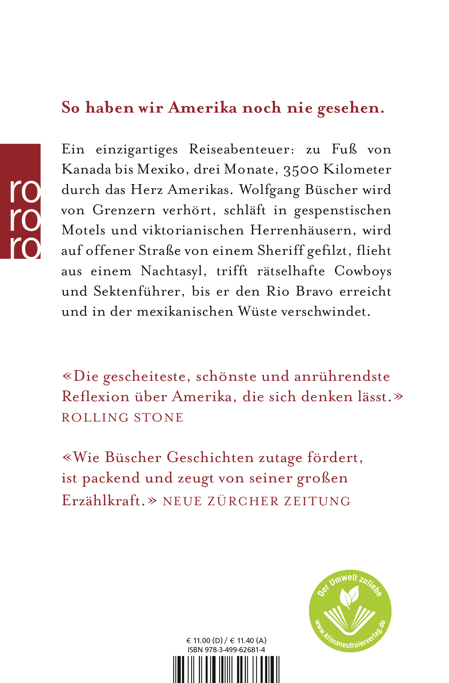 Ein einzigartiges Reiseabenteuer: zu Fuß von Kanada bis Mexiko, drei Monate, 3500 Kilometer durch das Herz Amerikas. Wolfgang Büscher wird von Grenzern verhört, schläft in gespenstischen Motels und viktorianischen Herrenhäusern, wird auf offener Straße von einem Sheriff gefilzt, flieht aus einem Nachtasyl, trifft rätselhafte Cowboys und Sektenführer, bis er den Rio Bravo erreicht und in der mexikanischen Wüste verschwindet.