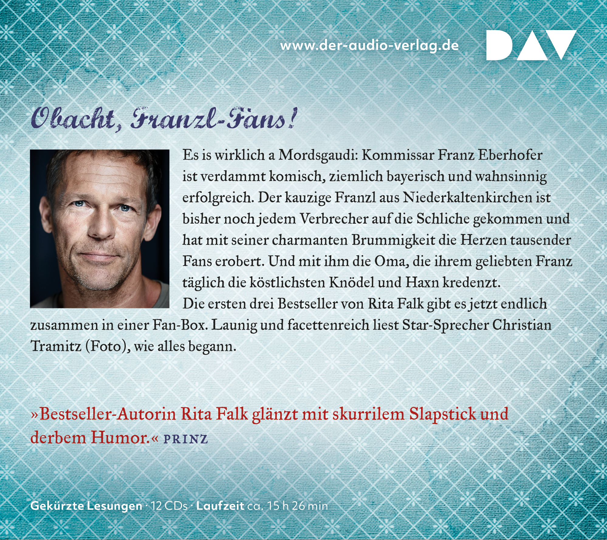 Christian Tramitz, geboren in München, spielte mit Bully Herbig in der preisgekrönten »Bullyparade« und erreichte mit seiner Rolle des Rangers in »Der Schuh des Manitu« Kultstatus. Er ist regelmäßig im Fernsehen zu sehen, beispielsweise in der beliebten ARD-Krimiserie »Hubert ohne Staller«. Christian Tramitz liest für DAV und eine riesige Fangemeinde alle Teile der Hörbuch-Reihe um Franz Eberhofer ein.