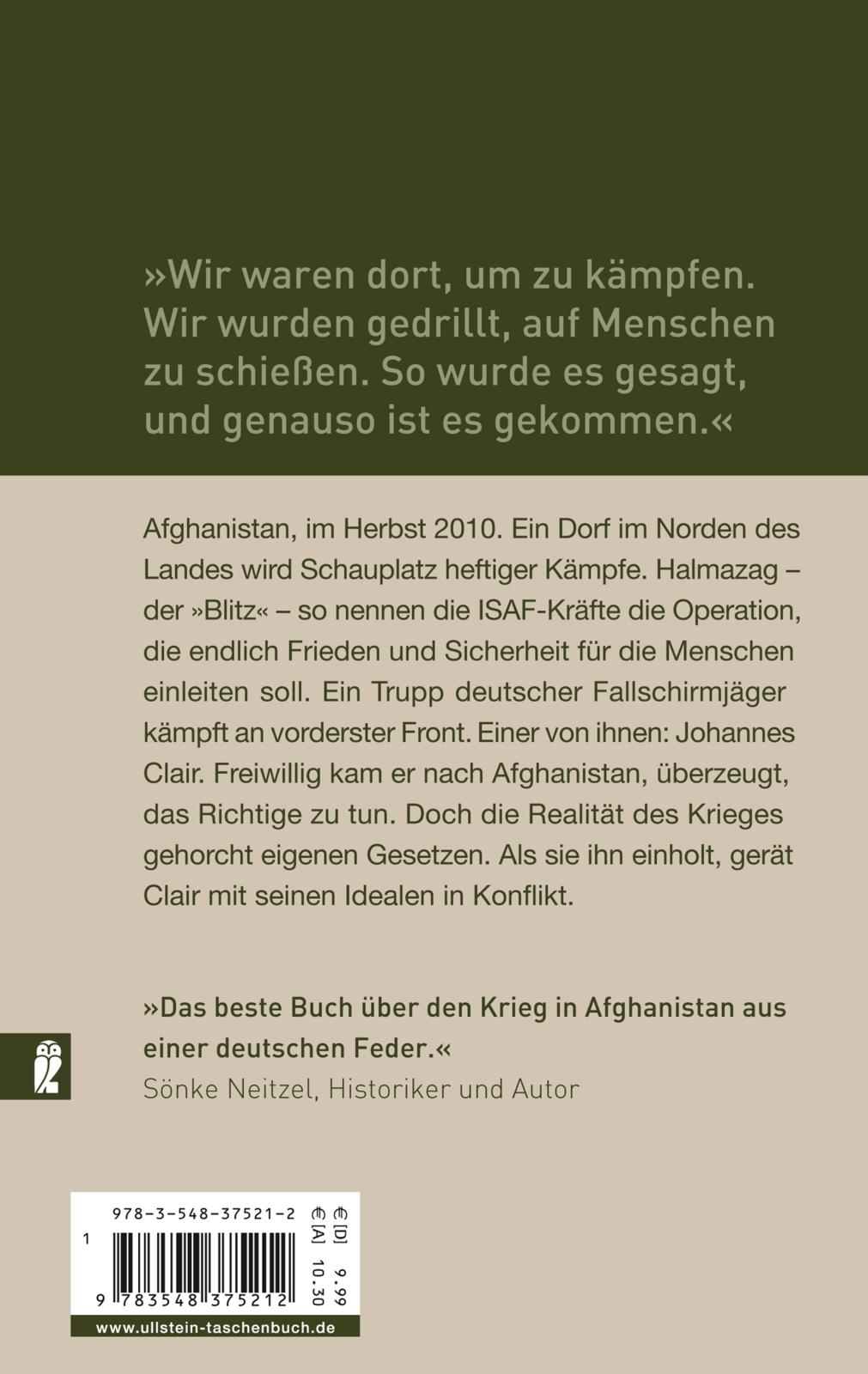 Afghanistan, im Herbst 2010. Ein Dorf im Norden des Landes wird Schauplatz heftiger Kämpfe. »Halmazag« - »Blitz«, so nennen die ISAF-Kräfte die Operation, die endlich Frieden und Sicherheit für die Menschen bringen soll. Ein Trupp deutscher Fallschirmjäger kämpft an vorderster Front. Einer von ihnen: Johannes Clair. Freiwillig kam er nach Afghanistan, überzeugt, das Richtige zu tun. Doch die Realität des Krieges gehorcht eigenen Gesetzen. Als sie ihn einholt, gerät Clair mit seinen Idealen in Konflikt.