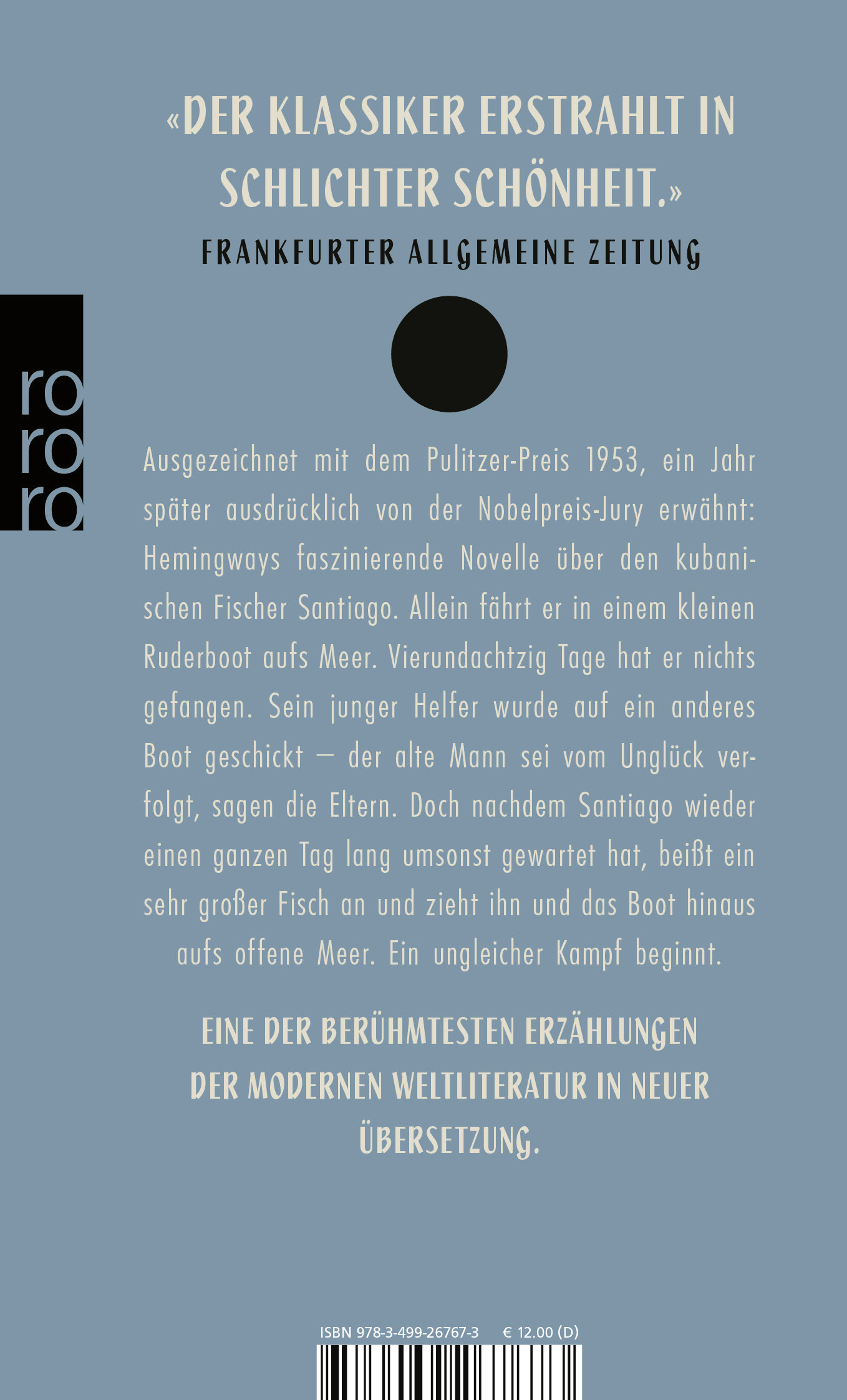 Hemingways faszinierende Novelle über den kubanischen Fischer Santiago. Allein fährt der in einem kleinen Ruderboot aufs Meer. Vierundachtzig Tage hat er nichts gefangen. Sein junger Helfer wurde auf ein anderes Boot geschickt - der alte Mann sei vom Unglück verfolgt, sagen die Eltern. Doch nachdem Santiago wieder einen ganzen Tag lang umsonst gewartet hat, beißt ein sehr großer Fisch an und zieht ihn und das Boot hinaus aufs offene Meer. Ein ungleicher Kampf beginnt.