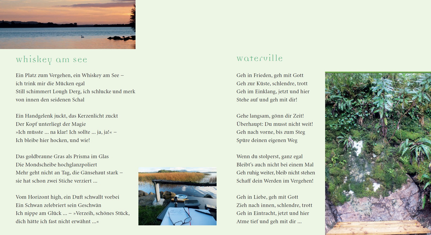 "Unter Regenschirmen" Sie haben viel geweint, die Tränen irisch nass / Gesichter wurden löslich, die Blicke leichenblass / An strengen Haltestellen, in Häfen kalt und grau / Unter Regenschirmen (klein, klapprig, dunkelblau) // Sie haben viel gelacht, oft lauter als der Wind / Den Tag damit verbracht, zu spüren wer sie sind / Am liebsten Arm in Arm, beim Hurling in Block zehn / Unter Regenschirmen (groß, mit Vereinsemblem!) // Sie haben viel geküsst, dann riss der Himmel auf / Im Schlüsselbein-Bereich fest einklemmt den Knauf / Die Lippen weich wie Moose, ein Fest für jede Hand / Unter Regenschirmen (knallrot, am Shannon-Strand) // Sie sind daheim gestorben, waren müde irgendwann / Zwei Töchter in Australien, der Sohn blieb auf dem Land / "Maria, hilf den Seelen", der Pfarrer betet laut / Unter Regenschirmen ... bis tief unter die Haut
