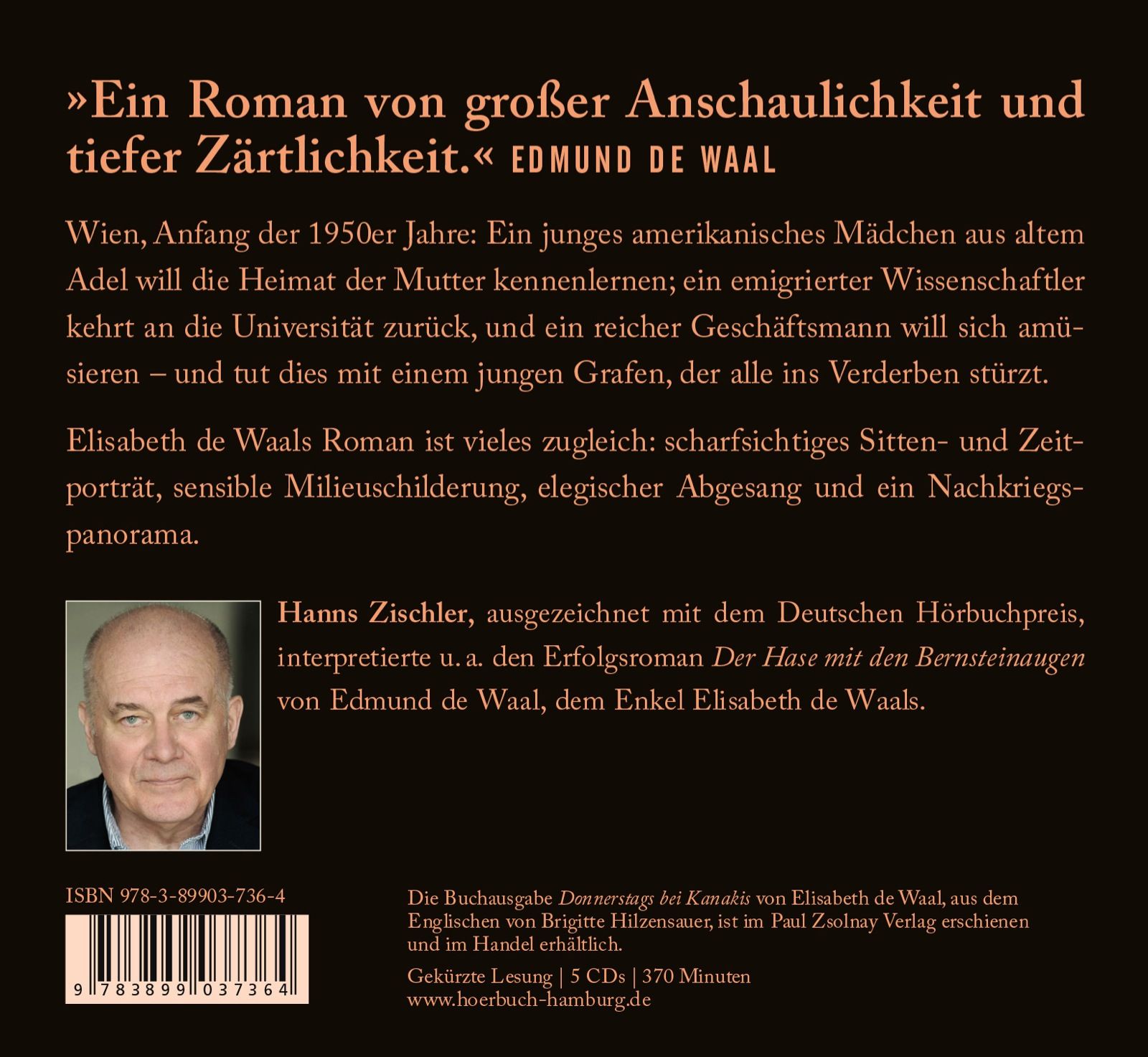 Hanns Zischler, Jahrgang 1947, ist nicht nur Schauspieler und Sprecher, sondern arbeitet seit vielen Jahren als Schriftsteller, Übersetzer und Fotograf. Er war in Kinofilmen von Regisseuren wie Wim Wenders und Steven Spielberg zu sehen. Mit seiner markanten Stimme hat er bereits zahlreiche Texte zum Leben erweckt, darunter Werke von Thomas Mann, Truman Capote und Vladimir Nabokov. 2010 wurde er mit dem Deutschen Hörbuchpreis ausgezeichnet.