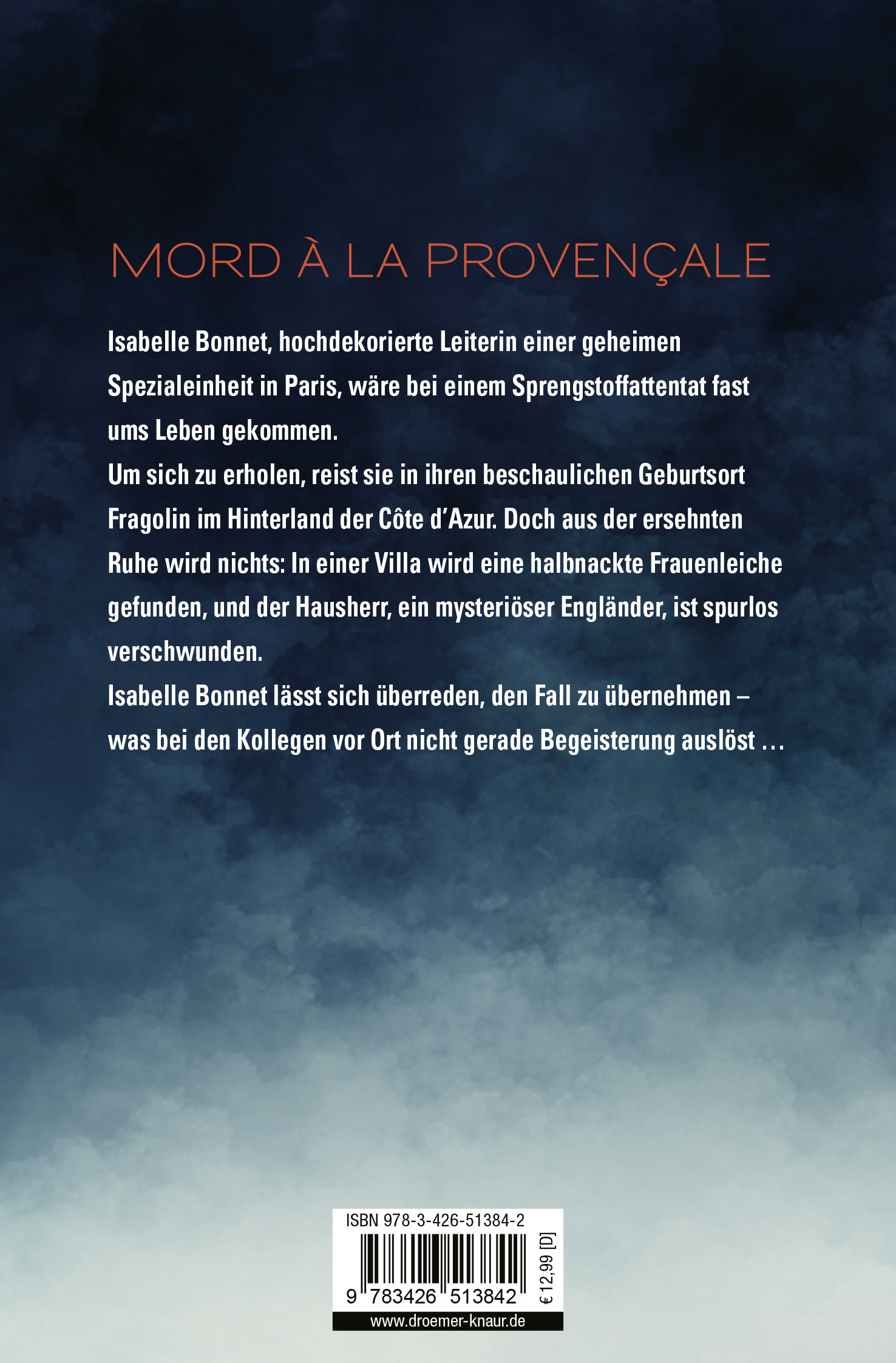 Isabelle Bonnet, Leiterin einer geheimen Spezialeinheit in Paris, wäre bei einem Sprengstoffattentat fast ums Leben gekommen. Für ihren Erholungs-Urlaub reist sie in ihren Geburtsort Fragolin in der Provence. Doch mit der Ruhe ist es schnell vorbei, denn erst verschwindet ein reicher Engländer aus seiner Villa und dann wird am Strand von Saint-Tropez eine Frauenleiche gefunden. Isabelle Bonnet lässt sich überreden, den Fall (degradiert zur Kommissarin und ausgestattet mit falschem Lebenslauf) zu übernehmen - was bei den Kollegen vor Ort nicht gerade Begeisterung auslöst, denn in der Provence-Provinz herrschen noch eine ganze Menge Vorurteile. Doch mit dem dümmlich wirkenden Polizei-Archivar wird ihr ein unerwartet findiger Assistent zur Seite gestellt. Was wollte der mysteriöse Engländer in der Provence? Und auch die Rätsel aus Isabelles eigener Vergangenheit, der Unfalltod ihrer Eltern, müssen dringend gelöst werden...