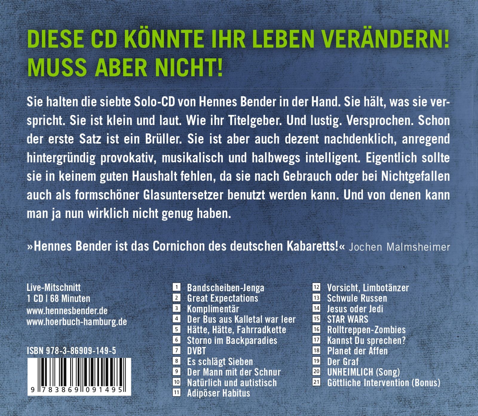 | Schlagworte | Comedy • Hannes Bender • Hennes • Hörbuch; Kabarett • Kabarett • Live • Livelesung • Oberhausen • Ruhrgebiet • Ruhrpott |