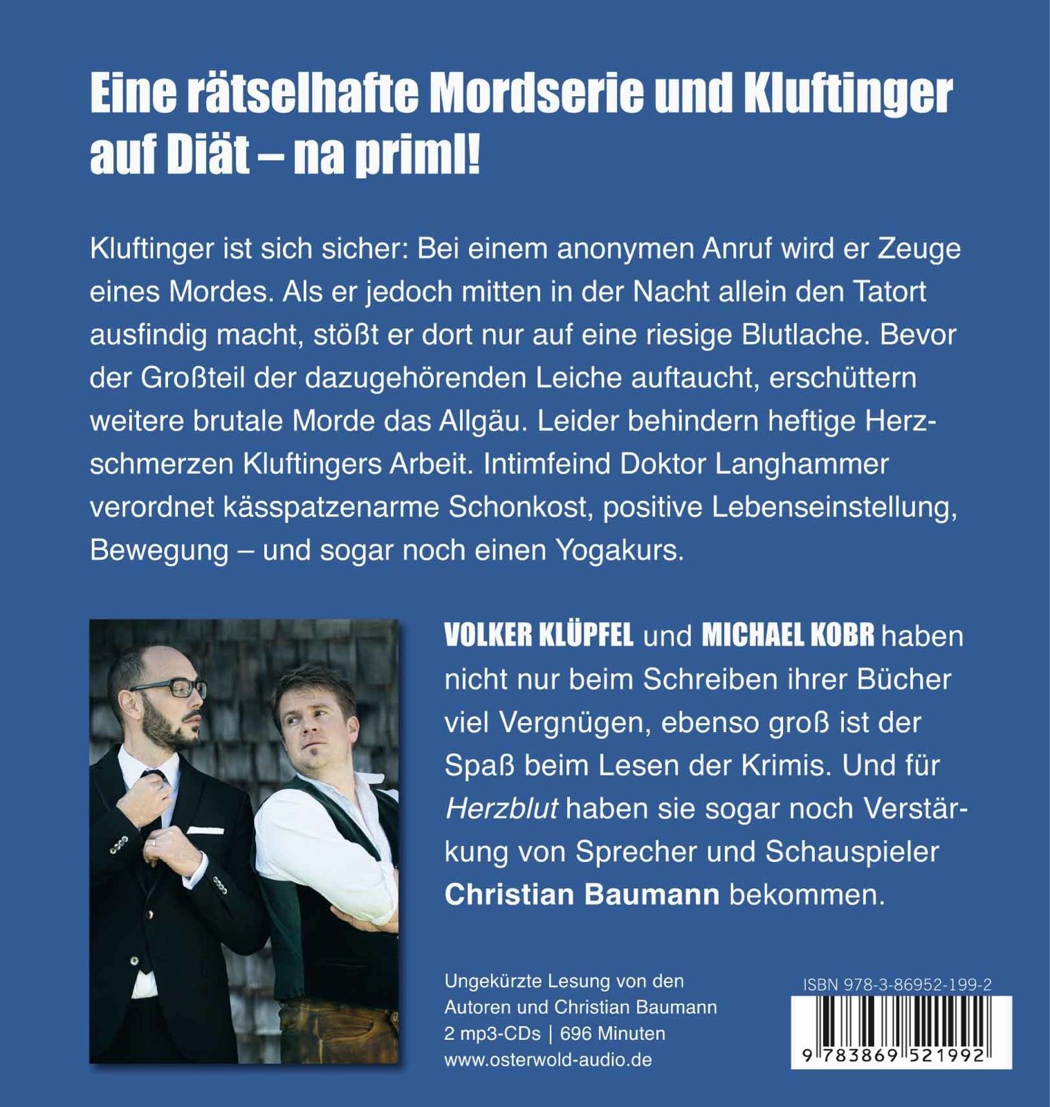 Volker Klüpfel und Michael Kobr haben nicht nur beim Schreiben ihrer Bücher viel Vergnügen, ebenso groß ist der Spaß beim Lesen der Krimis - in breitestem Allgäuerisch und mit verteilten Rollen. Und für Herzblut haben sie sogar noch Verstärkung von Sprecher und Schauspieler Christian Baumann bekommen.