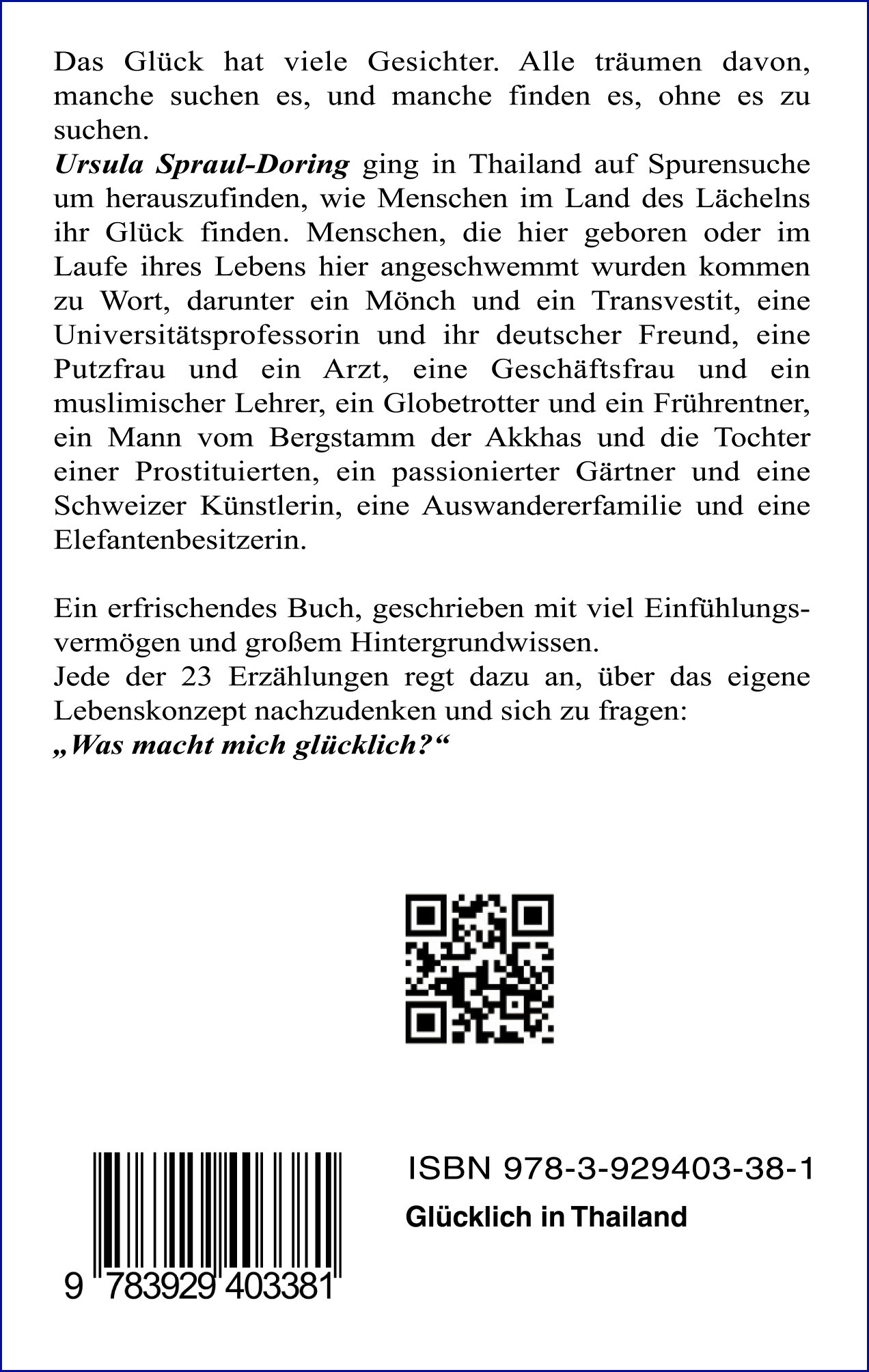 Das Glück hat viele Gesichter. Alle träumen davon, manche suchen es, und manche finden es, ohne es zu suchen.Ursula Spraul-Doring ging in Thailand auf Spurensuche um herauszufinden, wie Menschen im Land des Lächelns ihr Glück finden. Menschen, die hier geboren oder im Laufe ihres Lebens hier angeschwemmt wurden kommen zu Wort, darunter ein Mönch und ein Transvestit, eine Putzfrau und ein Arzt, eine Universitätsprofessorin und ihr deutscher Freund, eine Geschäftsfrau und ein muslimischer Lehrer, ein Globetrotter und ein Frührentner, ein Mann vom Bergstamm der Akkhas und die Tochter einer Prostituierten, ein passionierter Gärtner und eine Schweizer Künstlerin, eine Auswandererfamilie und eine Elefantenbesitzerin.