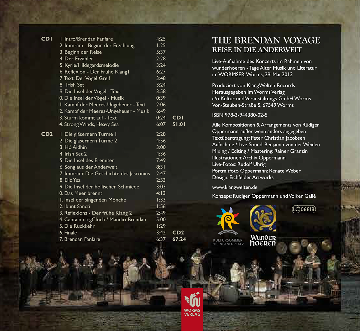 The Brendan Voyage - Doppel-CD einer Uraufführung. Die Reise des irischen Mönchs Brendan zu mythischen Inseln im Westen ist eine der großen Erzählungen im frühen Mittelalter Europas. Im Rahmen des Wormser Festivals "wunderhoeren - Tage alter Musik und Literatur" gab es die Uraufführung einer Komposition des Textes durch den Harfenisten Rüdiger Oppermann. Aufgenommen im WORMSER, Worms 29. Mai 2013