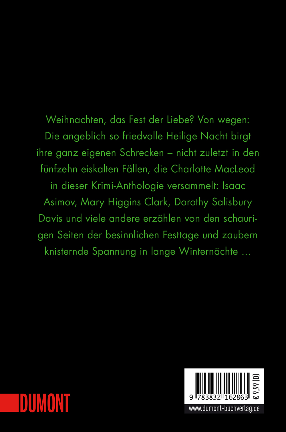 Weihnachten, das Fest der Liebe? Von wegen: Die angeblich so friedvolle Heilige Nacht birgt ihre ganz eigenen Schrecken – das beweisen fünfzehn blutig-besinnliche Kurzkrimis rund um die Weihnachtszeit, verfasst von Isaac Asimov, Mary Higgins Clark, Dorothy Salisbury Davis und anderen namhaften Autoren, nicht zuletzt von Charlotte MacLeod selbst, der Grande Dame der klassischen Kriminalliteratur, die diese Anthologie zusammengestellt und mit Einleitungen versehen hat.