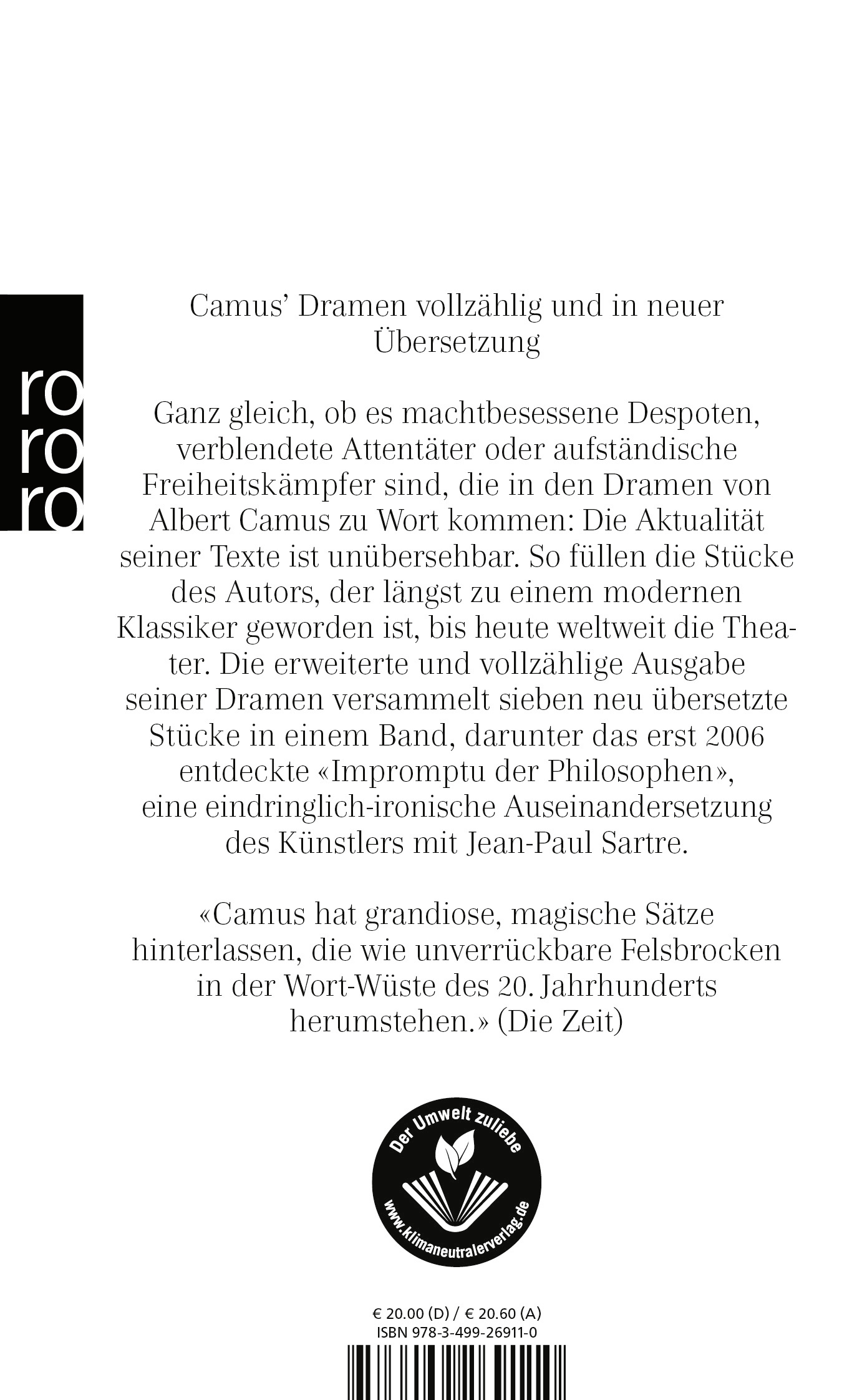 Ganz gleich, ob es machtbesessene Despoten, verblendete Attentäter oder aufständische Freiheitskämpfer sind, die in den Dramen von Albert Camus zu Wort kommen: Die Aktualität seiner Texte ist unübersehbar. So füllen die Stücke des Autors, der längst zu einem modernen Klassiker geworden ist, bis heute weltweit die Theater. Die erweiterte und vollzählige Ausgabe seiner Dramen versammelt sieben neu übersetzte Stücke in einem Band, darunter das erst 2006 entdeckte «Impromptu der Philosophen», eine eindringlich-ironische Auseinandersetzung des Künstlers mit Jean-Paul Sartre.