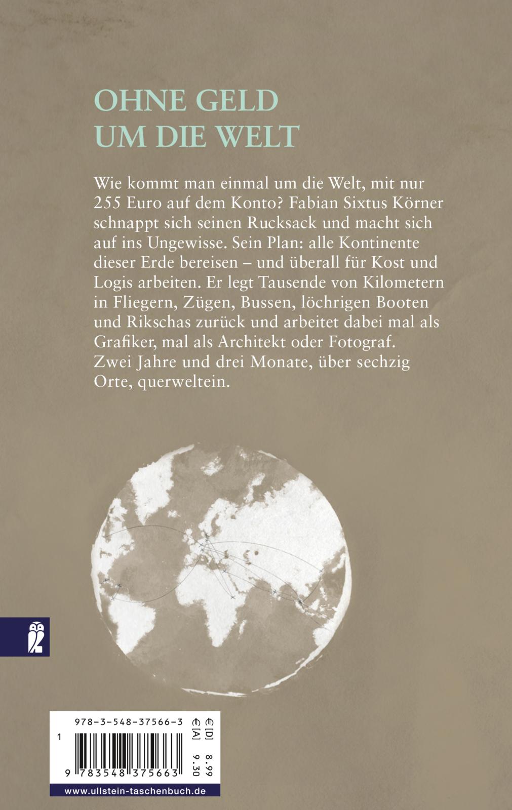 Wie kommt man einmal um die Welt, mit nur 255 Euro auf dem Konto? Fabian Sixtus Körner schnappt sich seinen Rucksack und macht sich auf ins Ungewisse. Sein Plan: alle Kontinente dieser Erde bereisen - und überall für Kost und Logis arbeiten. Er legt Tausende von Kilometern in Fliegern, Zügen, Bussen, löchrigen Booten und Rikschas zurück und arbeitet dabei mal als Grafiker, mal als Architekt oder Fotograf. Zwei Jahre und zwei Monate, über 60 Orte, querweltein.