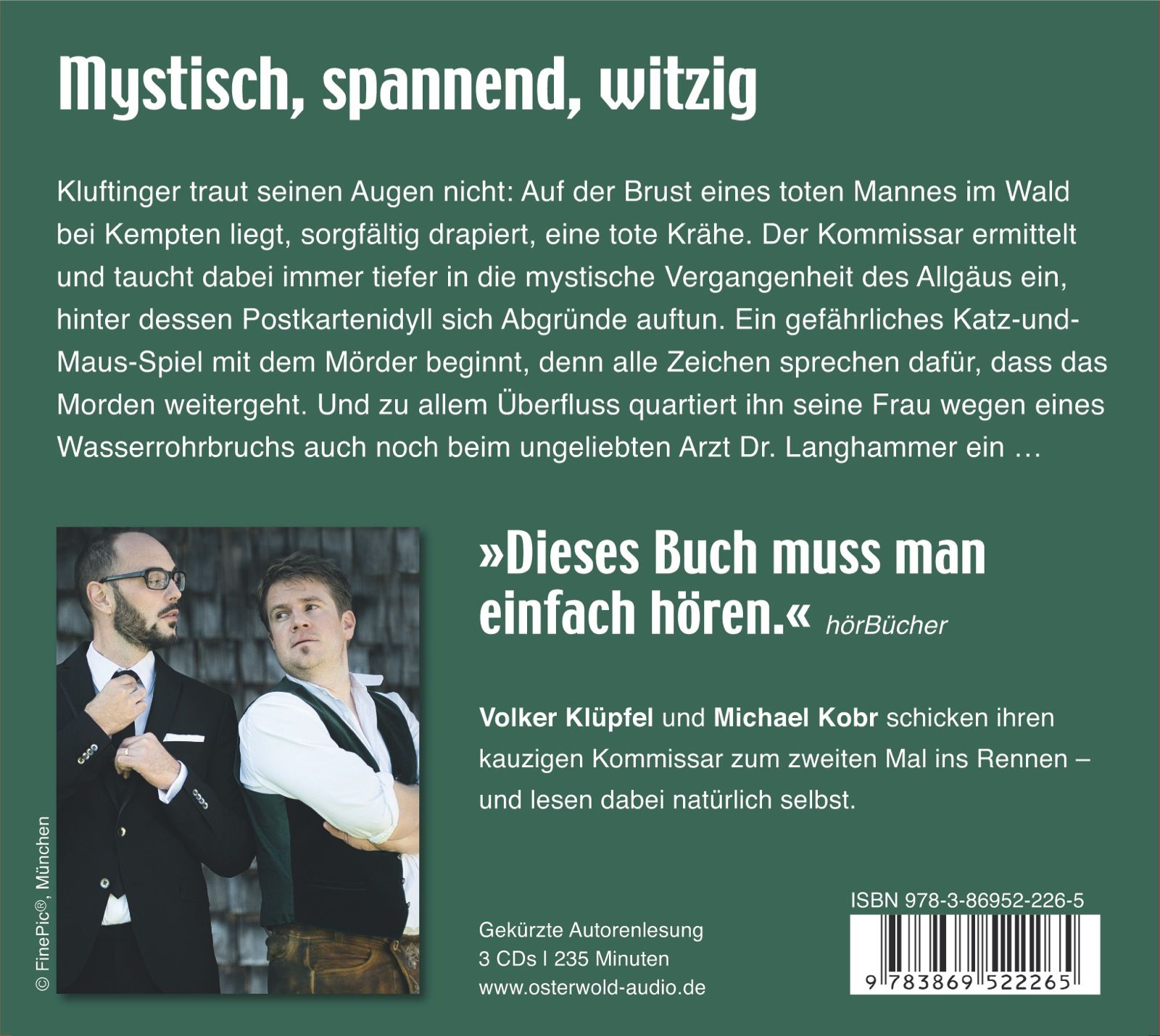Der Allgäuer Kriminalkommissar Kluftinger traut seinen Augen nicht: Auf der Brust eines toten Mannes in einem Wald bei Kempten liegt, sorgfältig drapiert, eine tote Krähe. Im Laufe der Ermittlungen taucht der Kommissar immer tiefer in die mystische Vergangenheit des Allgäus ein, und es beginnt ein Katz-und-Maus-Spiel mit dem Mörder, bei dem die Zeit gegen ihn arbeitet. Denn alle Zeichen sprechen dafür, dass das Morden weitergeht. Zu allem Überfluss quartiert ihn seine Frau wegen eines Wasserrohrbruchs auch noch beim ungeliebten Dr. Langhammer ein.