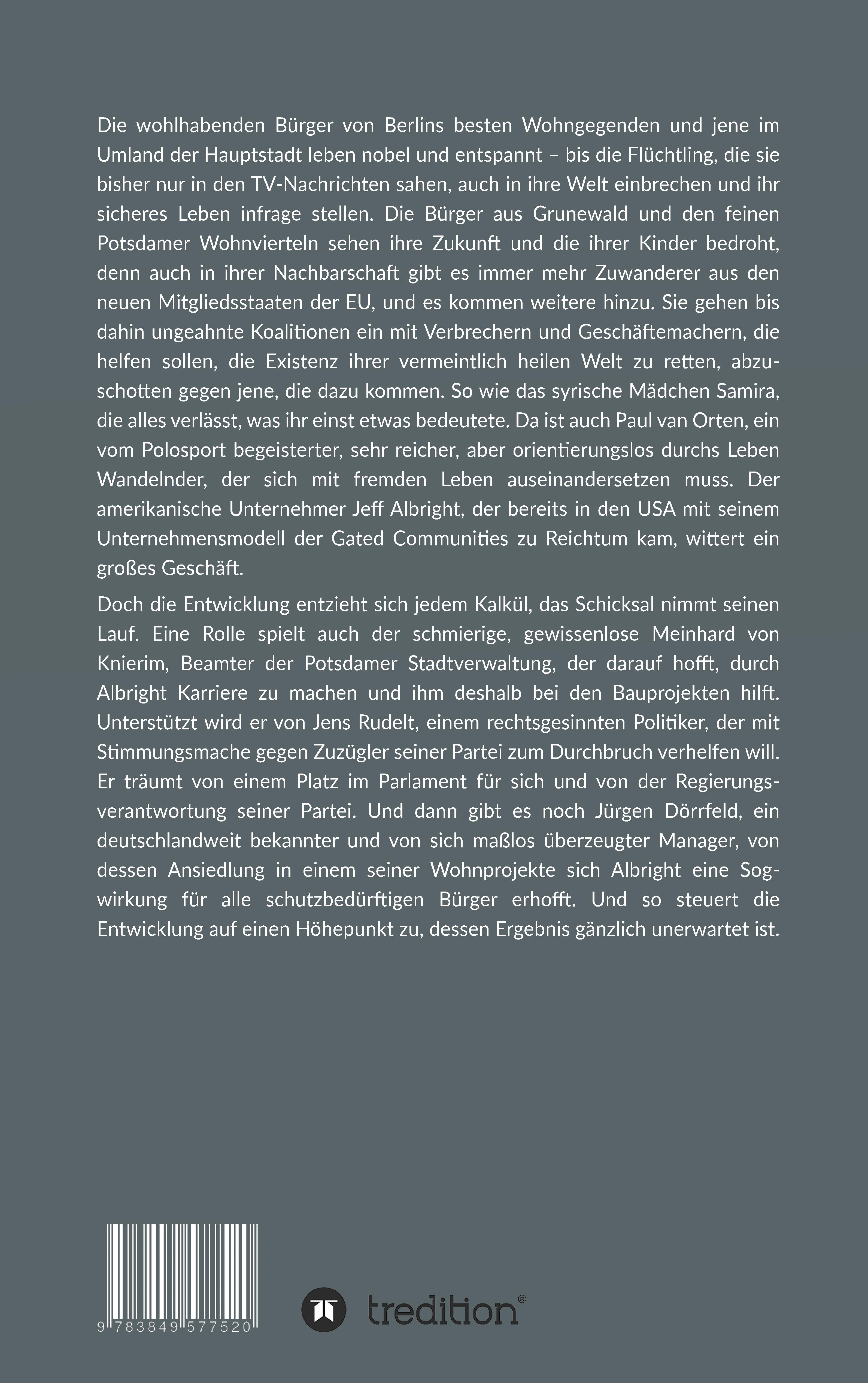 Die wohlhabenden Bürger von Berlins besten Wohngegenden und jene im Umland der Hauptstadt leben nobel und entspannt - bis die Flüchtling, die sie bisher nur in den TV-Nachrichten sahen, auch in ihre Welt einbrechen und ihr sicheres Leben infrage stellen. Die Bürger aus Grunewald und den feinen Potsdamer Wohnvierteln sehen ihre Zukunft und die ihrer Kinder bedroht, denn auch in ihrer Nachbarschaft gibt es immer mehr Zuwanderer aus den neuen Mitgliedsstaaten der EU, und es kommen weitere hinzu. Sie gehen bis dahin ungeahnte Koalitionen ein mit Verbrechern und Geschäftemachern, die helfen sollen, die Existenz ihrer vermeintlich heilen Welt zu retten, abzuschotten gegen jene, die dazu kommen. So wie das syrische Mädchen Samira, die alles verlässt, was ihr einst etwas bedeutete. Da ist auch Paul van Orten, ein vom Polosport begeisterter, sehr reicher, aber orientierungslos durchs Leben Wandelnder, der sich mit fremden Leben auseinandersetzen muss. Der amerikanische Unternehmer Jeff Albright, der bereits in den USA mit seinem Unternehmensmodell der Gated Communities zu Reichtum kam, wittert ein großes Geschäft. Doch die Entwicklung entzieht sich jedem Kalkül, das Schicksal nimmt seinen Lauf. Eine Rolle spielt auch der schmierige, gewissenlose Meinhard von Knierim, Beamter der Potsdamer Stadtverwaltung, der darauf hofft, durch Albright Karriere zu machen und ihm deshalb bei den Bauprojekten hilft. Unterstützt wird er von Jens Rudelt, einem rechtsgesinnten Politiker, der mit Stimmungsmache gegen Zuzügler seiner Partei zum Durchbruch verhelfen will. Er träumt von einem Platz im Parlament für sich und von der Regierungsverantwortung seiner Partei. Und dann gibt es noch Jürgen Dörrfeld, ein deutschlandweit bekannter und von sich maßlos überzeugter Manager, von dessen Ansiedlung in einem seiner Wohnprojekte sich Albright eine Sogwirkung für alle schutzbedürftigen Bürger erhofft. Und so steuert die Entwicklung auf einen Höhepunkt zu, dessen Ergebnis gänzlich unerwartet ist.