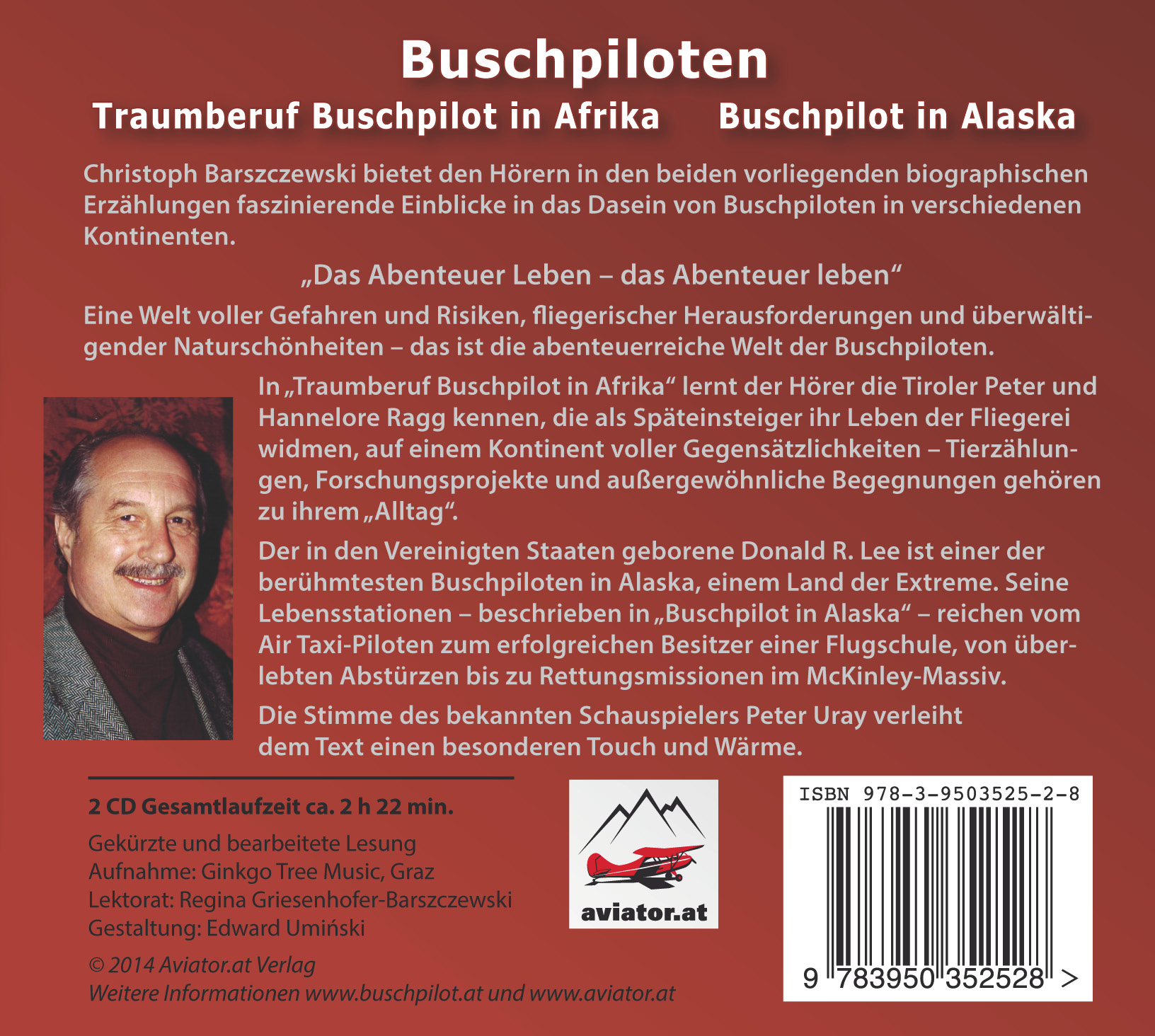 Christoph Barszczewski, der „Aviator.at“, geb. 1958, ist gebürtiger Pole und lebt nach seiner Flucht aus dem damals noch kommunistischen Polen seit 1988 in Österreich. Neben seiner Arbeit in einer Softwarefirma in Wien betätigt er sich als Pilot abseits der regulären Pisten, Journalist und Fotograf. Er schreibt regelmäßig für verschiedene Flugfachzeitschriften in Österreich, Deutschland und Polen. Seit 2003 betreibt er die populäre Fliegerseite „Aviator.at“. Sein erstes Buch „Traumberuf Buschpilot in Afrika“ ist 2007 erschienen. Seine Passion gilt in den letzten Jahren der Wildnis Alaskas und im Jahr 2011 absolviert er in Don Lees Flugschule die Ausbildung zum Berufspiloten für Wasserflugzeuge. „Buschpilot in Alaska“ ist sein zweites Buch. Seine Liebe zur Fliegerei, die eigenen Flugerfahrungen abseits der gewöhnlichen Pisten und schließlich eine ungebrochene Neugierde auf Menschen und Geschichten haben ihn zu außergewöhnlichen Persönlichkeiten geführt, über deren Leben er authentisch und voller Leidenschaft zu erzählen versteht. Die vorliegende, gekürzte und bearbeitete Hörbuschversion basiert auf den beiden bisher erschienenen Büchern.