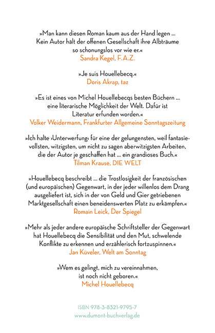 »Wer mich vereinnahmen will, ist noch nicht geboren.« Michel Houellebecq im Interview mit Canal Plus »Der umwerfendste Schriftsteller unserer Gegenwart.« Julia Encke, F.A.S. »Der neue Roman von Michel Houellebecq ist schrecklich. Er entwirft das Bild eines islamistischen Gottesstaates in Frankreich in der nahen Zukunft. Nicht dass der Roman nicht lesenswert wäre. Im Gegenteil: man kann ihn kaum aus der Hand legen. Man redet sich ein, dass die Kunst alles darf, doch die Unruhe, die den Leser erfasst, verlässt ihn nicht. Es ist ein Roman, der einen abstößt und zugleich fasziniert [...]. Der stupende Diagnostiker Houellebecq zielt so furcht- wie gnadenlos ins Herz westlicher Angst. Kein Autor hält der offenen Gesellschaft ihre Albträume so schonungslos vor wie er.« Sandra Kegel, F.A.Z. »Eine literarische Bombe [...]. Der Meister der subversiven Provokation [...] meldet sich als radikaler Zeitdiagnostiker und schwärzester Kulturpessimist mit einer politischen Fiktion [...].« Romain Leick, SPIEGEL »Ich halte 'Unterwerfung' für eine der gelungensten, weil fantasievollsten, witzigsten, um nicht zu sagen aberwitzigsten Arbeiten, die der Autor je geschaffen hat [...] ein grandioses Buch.« Tilman Krause, DIE WELT »Mit kühler Ambivalenz macht der Franzose dem inzwischen ja gerade zu freiheitsbesoffenen Westen vor, wie man wahrhaft frei denkt.« Edo Reents, F.A.Z. »Es kann gar nicht laut genug gesagt werden: 'Unterwerfung' ist kein rassistischer Roman, nicht frauenfeindlich und auch nicht islamophob. Es wimmelt darin nur von dergleichen Ansichten, aber davon, dass Houellebecq sie sich zu eigen machen würden, kann keine Rede sein [...]. Mehr als jeder andere europäische Schriftsteller der Gegenwart hat Houellebecq die Sensibilität und den Mut schwelende Konflikte zu erkennen und erzählerisch fortzuspinnen [...] in seiner hingebungsvoll verwüsteten Prosa.« Jan Küveler, WELT AM SONNTAG »Wer Houellebecq einen Skandalautor nennt, der nur vorsätzlich provoziere, der sollte de Sade, Rimbaud, Baudelaire, Balzac aus seiner Bibliothek entfernen oder mal lesen [...]. Houellebecq ist der Charlie Hebdo der europäischen Literatur. Je suis Houellebecq.« Doris Akrap, TAZ »'Unterwerfung' ist ein Buch der Angst und der Einsamkeit. Es handelt von der Liebe zur Literatur, der Liebe zu denen, die die Literatur erschaffen haben, von herrlichem Sex, traurigem Sex, Polygamie, vom Glück des guten Essens, dem phantastischen Glück guten Weins, von Schüssen in Paris, Bürgerkrieg, Desinteresse an Politik, und es endet mit einer friedlichen Vision [...]. Ein halb ironisches, halb ernstes Spiel mit den Möglichkeiten der Welt. Von geistiger Brandstiftung, Schüren von Ängsten ist da beim besten Willen nichts zu finden [...]. Die islamische Republik ist eine Houellebecqsche Traum-Vision, eine literarische Möglichkeit der Welt. Dafür ist Literatur erfunden worden.« Volker Weidermann, F.A.S. »Ein wichtiges Gedankenexperiment [...] Dieses Buch liefert Pegida-Idioten nicht die geringste Munition [...] Houellebecq fällt auf diesen Islamisierung-des-Abendlandes-Quatsch nicht herein [...] Wodurch er mir zuwider ist, sind seine Sex-Szenen. Ansonsten liefert er ein Gedankenspiel, das muss möglich sein.« Elke Heidenreich, MÜNCHNER ABENDZEITUNG »[Der Roman erscheint vielen als] eine Vorwegnahme des terroristischen Überfalls und [...] ein Lockruf des Schreckens [...]. Dagegen ist der Autor so machtlos wie gegen alle anderen Konsequenzen, die seine Leser aus seinen Büchern ziehen. Und er darf aus dieser Machtlosigkeit nicht die Konsequenz ziehen, den Roman seinen Folgen zu opfern.« Thomas Steinfeldt, SÜDDEUTSCHE ZEITUNG »Das Buch, über das im Januar ganz Frankreich spricht und bald auch ganz Deutschland« ZDF HEUTE JOURNAL »Nichts für intellektuelle Feiglinge. [...] Da ist etwas im Busch, und dieses Gefühl der Auflösung, nicht nur der Individuen, sondern auch der Gesellschaft und der Politik, ein Grundmotiv Houellebecqs, verdichtet sich im Lauf der Erzählung derart, dass der Leser das Buch nicht aus der Hand legen mag. Auch wenn er sich weder mit der Hauptperson noch mit Houellebecq identifiziert.« Gero von Randow, ZEIT ONLINE »Ein phänomenales, genaues Porträt der französischen Gesellschaft, vor allem ihrer Medien und der politischen Klasse, deren Personal unfreiwillig und ungefragt in Nebenrollen auftritt, wobei der Autor vor herrlichen Überzeichnungen nicht zurückschreckt. Rücksichtslos beschreibt er in eher platten Sätzen die französischen Realitäten, Tabus, Albträume und Obsessionen. Es ist ein heilsames Buch - eine Komödie, von der vielleicht sogar eine Katharsis ausgehen kann.« Jürg Altwegg, F.A.Z. »Der Roman ist am Ende nur ein ziemlich ernst gemeinter Spaß. Es wäre Unsinn, seinem Autor vorzuwerfen, den europäischen Rechtspopulismus, mit dessen Ängsten er sarkastisch spielt, noch zu schüren. Houellebecq - noch immer einer der begnadetsten Beobachter unserer Lebenslügen und Widersprüche - lässt sich nicht in die Karten gucken. Er schreibe [...] darüber, was die Leute so reden. Er sei eben das Produkt seiner Epoche.« Iris Radisch, DIE ZEIT »Kein Aufklärer hätte es besser sagen können.« Martina Meister, CICERO »Die Verführbarkeit zum Extremismus, das ist es, was Michel Houellebecqs Roman verhöhnt.« Christopher Schmidt, SÜDDEUTSCHE ZEITUNG »Die wahre Provokation seines Rom [...] ist die von ihm visionierte freiwillige Selbstaufgabe einer Gesellschaft, die sich von der Tradition des Kampfes um die Werte der Freiheit verbschiedet hat.« Georg Diez, DER SPIEGEL »Houellebecq beschreibt nüchtern und lakonisch, oft sehr witzig - aber er bewertet nicht. Damit muss man als Leser erst einmal zurechtkkommen.« Jochen Kürten, DEUTSCHE WELLE »Hoeuellebecq ist auf dem Höhepunkt seines Schreibens angelangt.« Wofgang Paterno, FORMAT »Ein zu Recht hochgelobter Roman.« Georg Hoffmann-Ostenhof, PROFIL »Dieses Buch verhandelt anregend einige der zentralen 