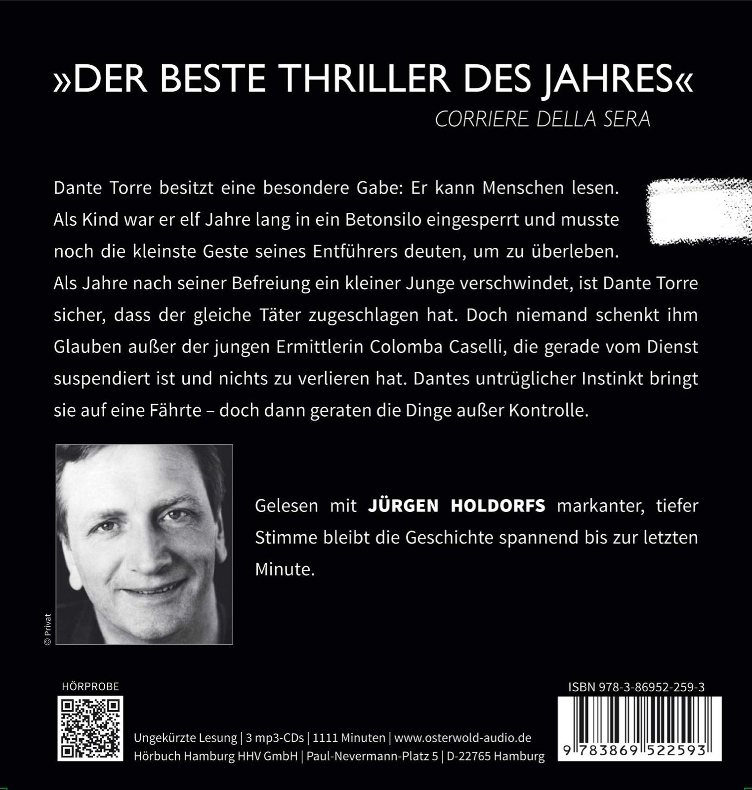 Dante Torre besitzt eine besondere Gabe. Er kann Menschen lesen. Aber er hat teuer dafür bezahlt. Elf Jahre war er eingesperrt in ein Betonverlies und darauf angewiesen, die kleinste Regung seines Entführers zu deuten. Als Jahre nach seiner Befreiung ein kleiner Junge verschwindet, weiß Dante Torre, dass der Mann, den er Vater nennen musste, dahintersteckt. Doch der Vater gilt längst als tot. Nur Colomba Caselli glaubt Dante. Sie ist jung, gerade vom Dienst suspendiert und hat nichts zu verlieren bei dieser Ermittlung fern von allen Regeln. Dantes Spürsinn bringt die traumatisierte Frau auf eine Fährte: Jahrelang sind unzählige Kinder entführt worden - mit dem Ziel, ihre Erinnerung auszulöschen und sie zu neuen Menschen zu machen. Jetzt wird Colomba Caselli endgültig von ihrer Vergangenheit eingeholt...