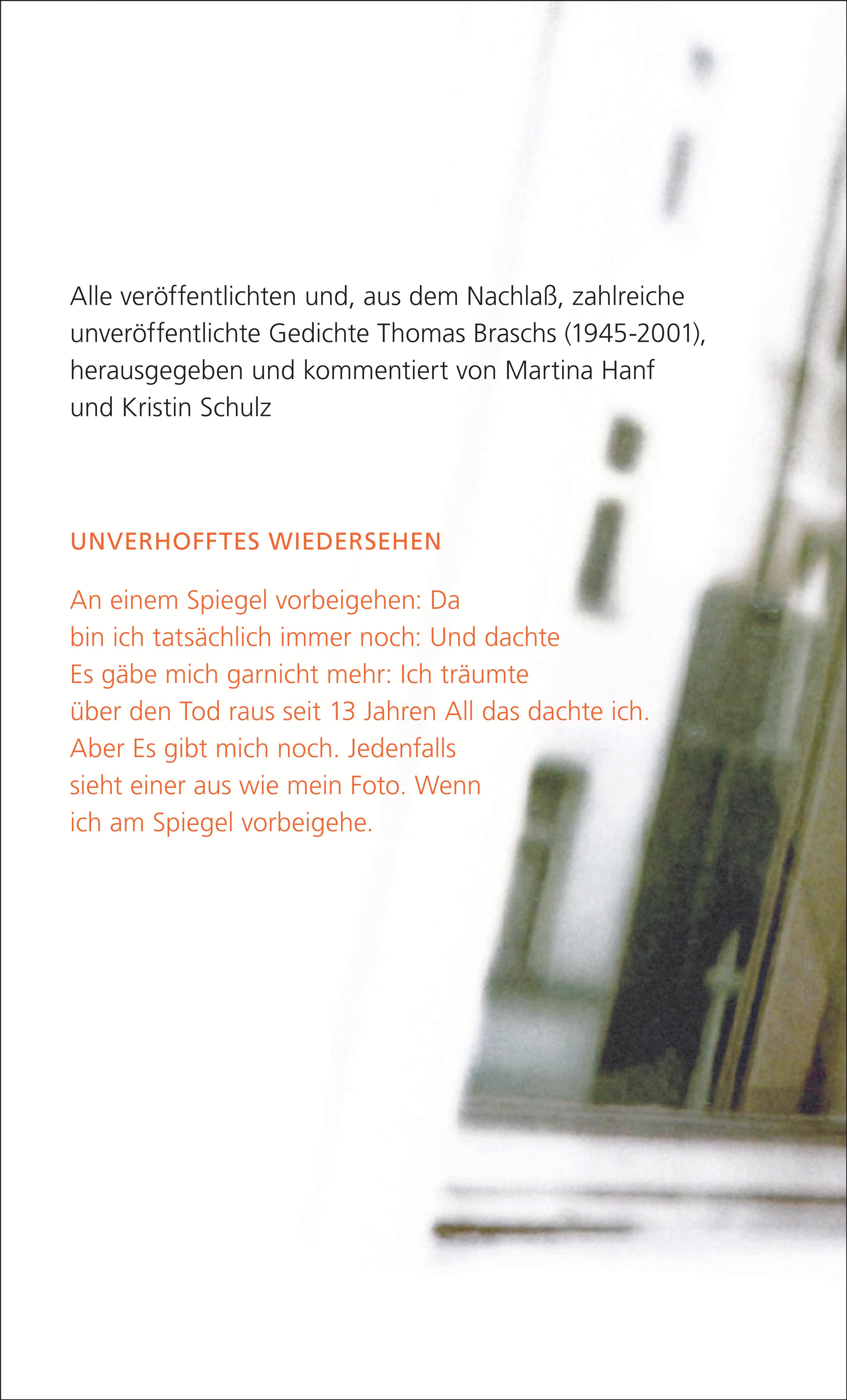 In zeitlicher Folge enthält die Ausgabe sämtliche zu Lebzeiten veröffentlichten Gedichte – darunter Raritäten wie die in der Reihe Poesiealbum veröffentlichte Sammlung von 1975, Braschs einzige DDR-Publikation von Gedichten, oder, seit Jahren vergriffen, Kargo. 32. Versuch auf einem untergehenden Schiff aus der eigenen Haut zu kommen aus dem Jahr 1977.