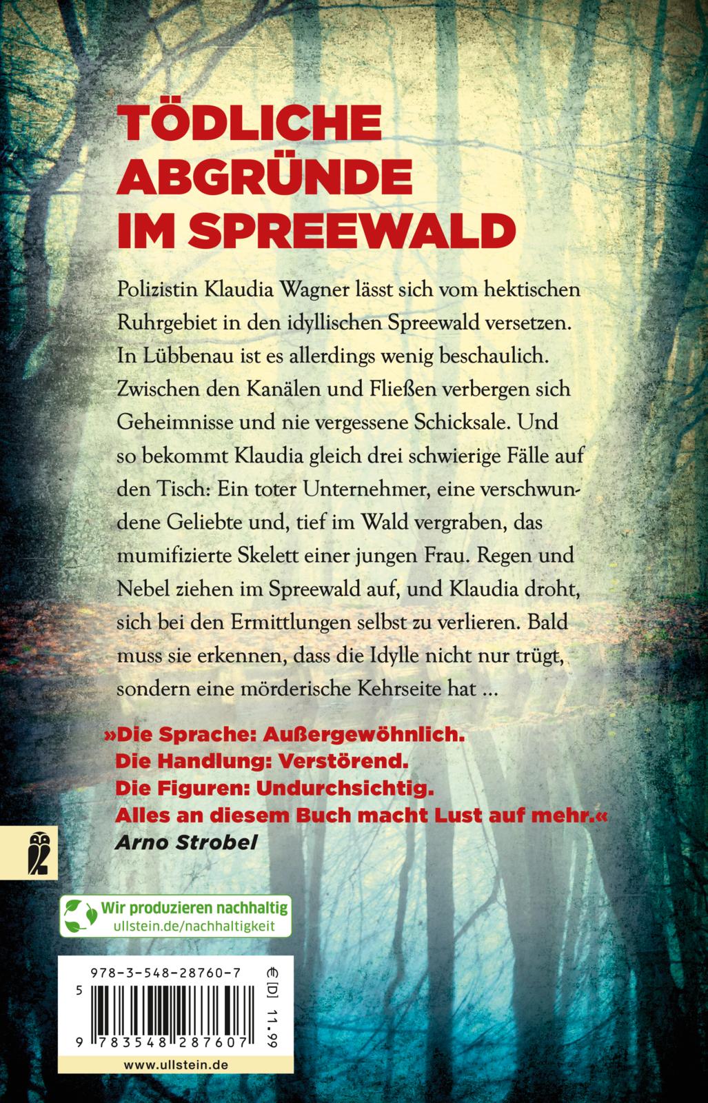 Polizistin Klaudia Wagner lässt sich vom hektischen Ruhrgebiet in den idyllischen Spreewald versetzen. In Lübbenau ist es allerdings wenig beschaulich. Zwischen den Kanälen und Fließen verbergen sich Geheimnisse und nie vergessene Schicksale. So auch in ihrem erstem Fall: Ein Unternehmer wird tot aufgefunden, seine Geliebte ist verschwunden. Dann findet Klaudia tief im Wald vergraben das Skelett einer jungen Frau. Regen und Nebel ziehen im Spreewald auf und Klaudia droht, sich bei den Ermittlungen selbst zu verlieren. Sie muss erkennen, dass die Idylle nicht nur trügt, sondern eine teuflische Kehrseite hat. »Die Sprache: Außergewöhnlich. Die Handlung: Verstörend. Die Figuren: Undurchsichtig. Alles an diesem Buch macht Lust auf mehr.« Arno Strobel