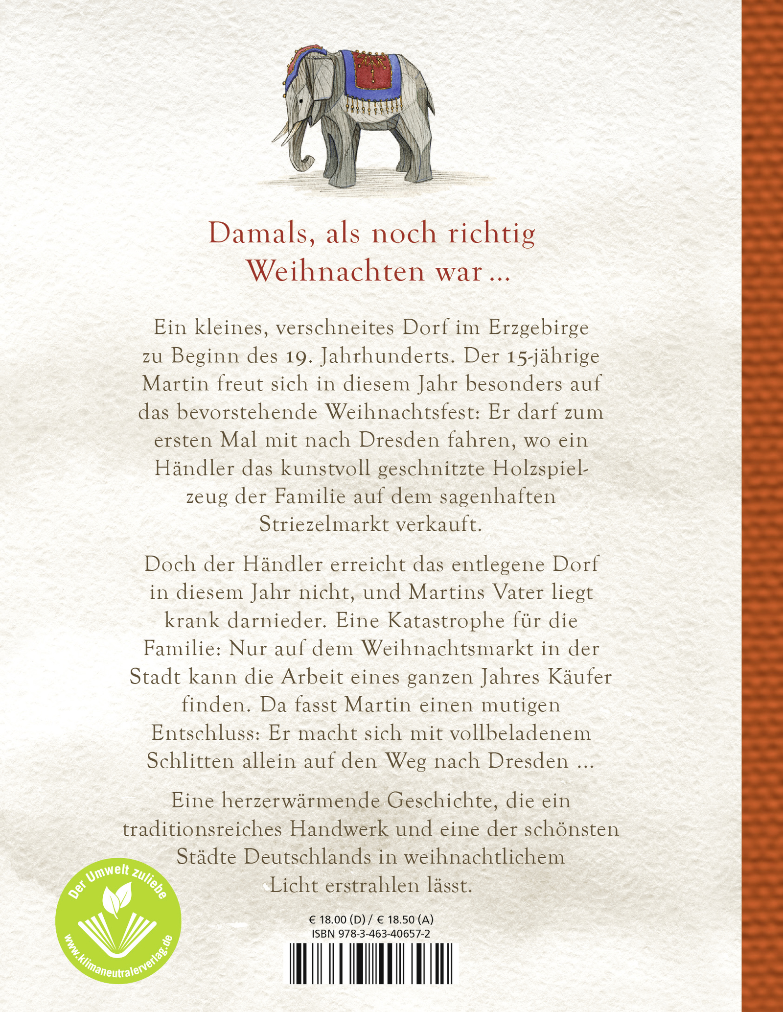 Doch der Händler erreicht das entlegene Dorf in diesem Jahr nicht, und Martins Vater liegt krank darnieder. Eine Katastrophe für die Familie: Nur auf dem Weihnachtsmarkt in der Stadt kann die Arbeit eines ganzen Jahres Käufer finden. Da fasst Martin einen mutigen Entschluss: Er macht sich mit voll beladenem Schlitten alleine auf den Weg nach Dresden ...