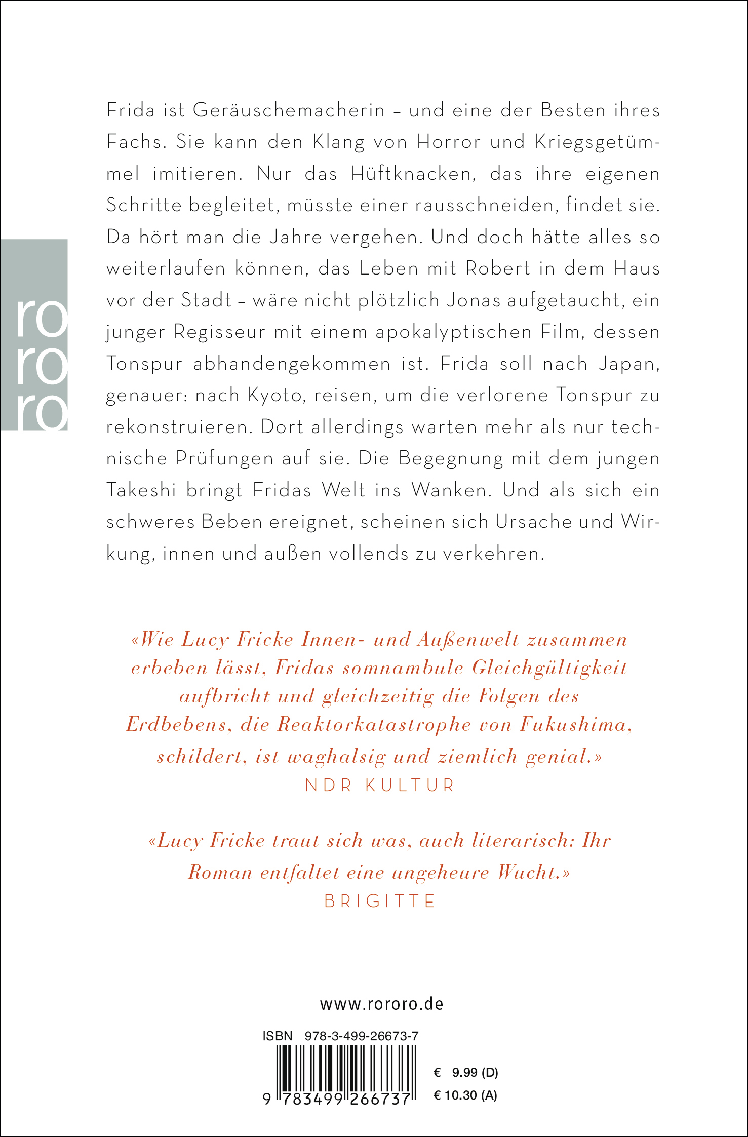 Frida ist Geräuschemacherin- und eine der Besten ihres Fachs. Sie kann den Klang von Horror und Kriegsgetümmel imitieren. Nur das Hüftknacken, das ihre eigenen Schritte begleitet, müsste einer rausschneiden, findet sie. Da hört man die Jahre vergehen. Und doch hätte alles so weiterlaufen können, das Leben mit Robert in dem Haus vor der Stadt - wäre nicht plötzlich Jonas aufgetaucht, ein junger Regisseur mit einem apokalyptischen Film, dessen Tonspur abhandengekommen ist. Frida soll nach Japan, genauer: nach Kyoto reisen, um die verlorene Tonspur zu rekonstruieren. Dort allerdings warten mehr als nur technische Prüfungen auf sie. Die Begegnung mit dem jungen Takeshi bringt Fridas Welt ins Wanken. Und als sich ein schweres Beben ereignet, scheinen sich Ursache und Wirkung, Innen und Außen vollends zu verkehren.