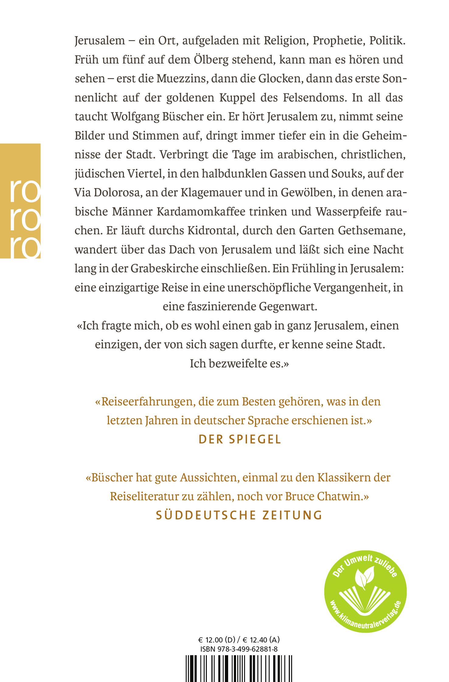 lt;p>Jerusalem - ein Ort, aufgeladen mit Religion, Prophetie, Politik. Früh um fünf auf dem Ölberg stehend, kann man es hören und sehen - erst die Muezzins, dann die Glocken, dann das erste Sonnenlicht auf der goldenen Kuppel des Felsendoms. In all das taucht Wolfgang Büscher ein. Er hört Jerusalem zu, nimmt seine Bilder und Stimmen auf, dringt immer tiefer ein in die Geheimnisse der Stadt. Verbringt die Tage im arabischen, christlichen, jüdischen Viertel, in den halbdunklen Gassen und Souks, auf der Via Dolorosa, an der Klagemauer und in Gewölben, in denen arabische Männer Kardamomkaffee trinken und Wasserpfeife rauchen. Er läuft durchs Kidrontal, durch den Garten Gethsemane, wandert über das Dach von Jerusalem und läßt sich eine Nacht lang in der Grabeskirche einschließen. Ein Frühling in Jerusalem: eine einzigartige Reise in eine unerschöpfliche Vergangenheit, in eine faszinierende Gegenwart.