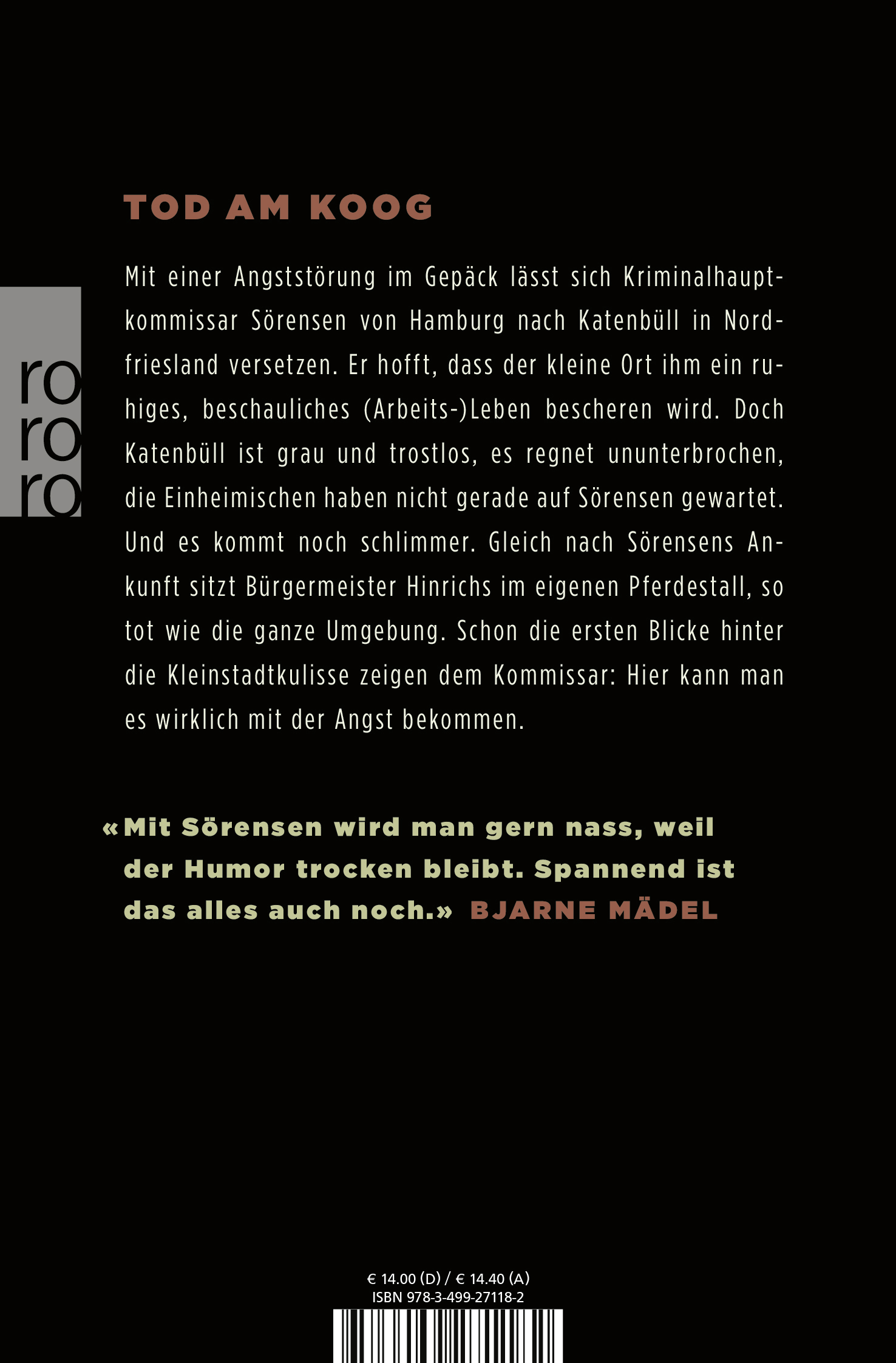 Mit einer Angststörung im Gepäck lässt sich Kriminalhauptkommissar Sörensen von Hamburg nach Katenbüll in Nordfriesland versetzen. Er hofft, dass der kleine Ort ihm ein ruhiges, beschauliches (Arbeits-)Leben bescheren wird. Doch Katenbüll ist grau und trostlos, es regnet ununterbrochen, die Einheimischen haben nicht gerade auf Sörensen gewartet. Und es kommt noch schlimmer. Gleich nach Sörensens Ankunft sitzt Bürgermeister Hinrichs im eigenen Pferdestall, so tot wie die ganze Umgebung. Schon die ersten Blicke hinter die Kleinstadtkulisse zeigen dem Kommissar: Hier kann man es wirklich mit der Angst bekommen.