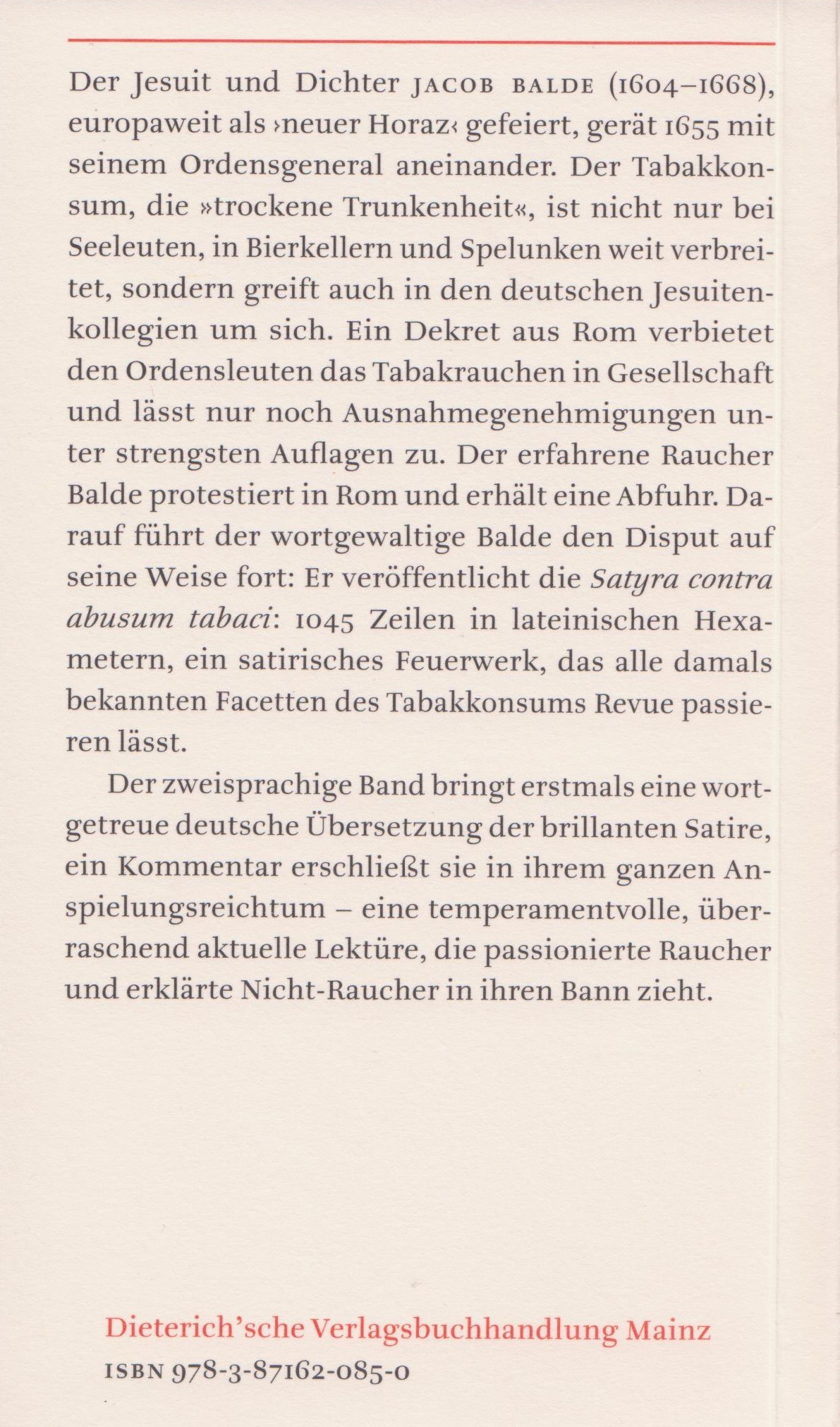 Der Jesuit und Dichter Jacob Balde (1604-1668), europaweit als 'neuer Horaz' gefeiert, gerät 1655 mit seinem Ordensgeneral aneinander. Der Tabakkonsum, die 'trockene Trunkenheit', ist nicht nur bei Seeleuten, in Bierkellern und Spelunken weit verbreitet, sondern greift auch in deutschen Jesuitenkollegien um sich.Ein Dekret aus Rom verbietet den Ordensleuten das Tabakrauchen in Gesellschaft und lässt nur noch Ausnahmegenehmigungen unter strengsten Auflagen zu. Der erfahrene Raucher Balde springt einem gemaßregelten Ordensbruder bei, protestiert in Rom und erhält eine Abfuhr. 1657 führt der wortgewaltige Prediger und mit allen menschlichen Schwächen vertraute Beichtvater Balde den Disput auf seine Weise fort: Er veröffentlicht die Satire wider den Tabakmissbrauch - Satyra contra abusum tabaci. 1045 Zeilen in lateinischen Hexametern, ein satirisches Feuerwerk, das alle damals bekannten Facetten des Tabakkonsums Revue passieren lässt. Gestank, Grimassieren und Gehuste der Raucher werden ebenso drastisch beschrieben wie der Kult ums Pfeifensammeln. Den 'GenussGenossen', die sich mit 'wohligem Nebeldunst' umhüllen, hält der Satiriker drakonisch entgegen: 'Wenn diese barbarische Hitze zu heftig angreift und die Organe vertrocknen lässt: da wird die Leber bald zu Stein'. Ja der rauchende Dichter, der die geistig anregende Wirkung des Nikotins ins Feld führt, spottet sogar über sich selbst: 'Wenn sich durch das Tabakkraut spitze Stacheln tief in die Brust bohren, dann hat die dichterische Ader freien Lauf, dann eilen die Füße, und die Rhythmen sammeln sich kompagnieweise in großer Zahl, gerade so als hätten sie den Fahneneid geleistet.'Der neue Band der excerpta classica bringt erstmals eine wortgetreue deutsche Übersetzung der brillanten Tabaksatire. Ein sorgfältiger Kommentar erschließt den Text in seinem ganzen Anspielungsreichtum - eine temperamentvolle,überraschend aktuelle Lektüre, die passionierte Raucher und erklärte Nicht-Raucher in ihren Bann zieht.