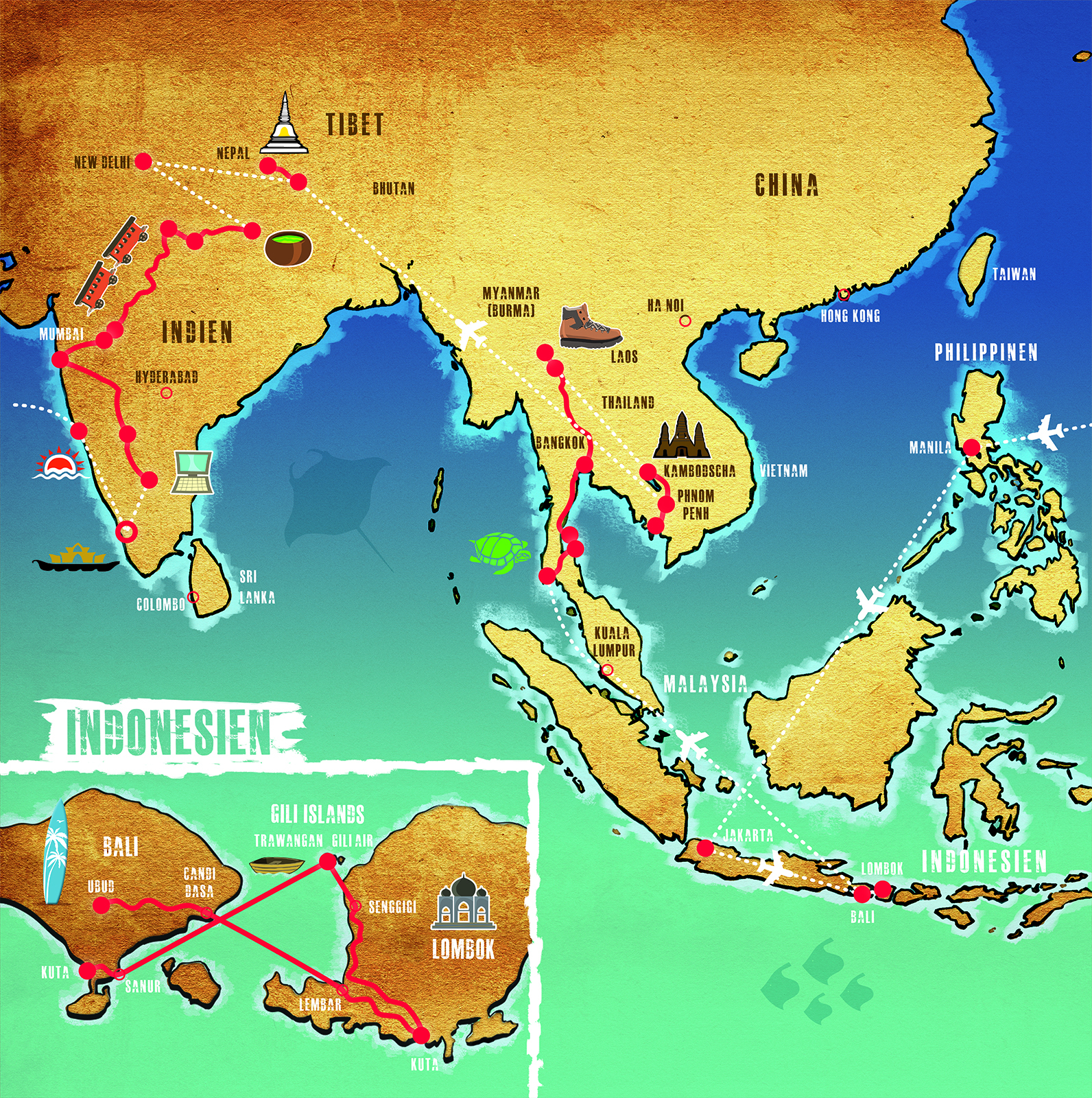 Von Kuba führt sie ihr Weg durch Mittel- und Südamerika, über Hawaii und quer durch Südostasien bis nach Indien. Tagelang quälen sich die beiden durch den kolumbianischen Dschungel, erkunden das Geheimnis der Hundertjährigen in Ecuador und steigen in Bolivien in tödliche Silberminen. Im Urlaubsparadies Thailand fühlen sie sich wie Außerirdische, und in Indien überleben sie knapp, ganz knapp, einen unfreiwilligen Drogentrip. Zum Glück, denn so können sie am Ende ihrer Reise noch Philipps vierzigköpfige indische Familie kennenlernen.