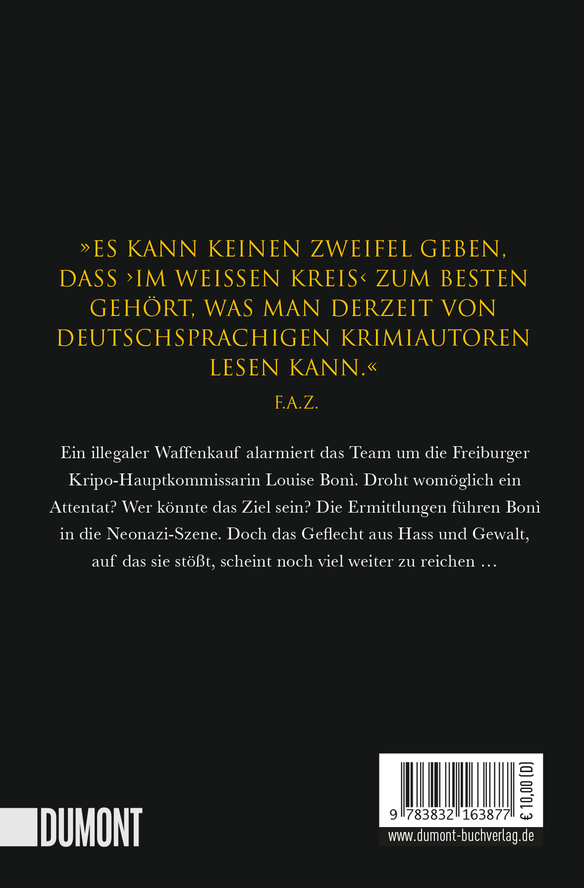 "Louise Bonì ist zurück. Eine Kriminalkommissarin, wie es sie nie gab. Verfolgt von Racheengeln, selbst einer von ihnen, mit Alkohol unerträglich, nüchtern noch mehr, ein Zuhörmonster, taumelnd von einer kaputten Liebe zur nächsten, genialer Bauchmensch, teamunfähig, widerborstig. Unsere unbedingte Lieblingskommissarin. Ein ganz schweres, ganz leichtes Buch." Elmar Krekeler, DIE WELT "Oliver Bottini schreibt dicht, konzentriert, faktenreich und mit einem besonderen Gespür für die Personen, ihre Stimmungen, ihre Hintergründe und Befindlichkeiten." Karin Trappe, HR INFO "Sie ist wieder da!" Julia Meyer Herrmann über Louise Boní, BILD "Es kann keinen Zweifel geben, dass "Im weißen Kreis" zum Besten gehört, was man derzeit von deutschsprachigen Krimiautoren lesen kann (...) Oliver Bottini zieht die Fäden dieser Geschichte auf schlanken dreihundert Seiten mit großer Ökonomie: ein rhythmischer Wechsel aus lebensechten Dialogen, knappen Drehbuchanweisungen, Traumsequenzen, nie bemüht, nicht forciert, immer fein austariert und dadurch Tempo erzeugend, ohne nach Cliffhängern zu schielen." Hannes Hintermeier, F.A.Z. "Bottini, schon immer ein straffer Schreiber stellt noch mehr Fragen zu Fanatismus, Schuld und Wiedergutmachung." Sylvia Staude, FRANKFURTER RUNDSCHAU "Schnelle Dialoge, harte Schnitte, dichte Milieuschilderungen, große Spannung - es ist einer der besten Krimis der Saison." DIE WELT AM SONNTAG "Bottini hat zwischenzeitlich nicht nur den Verlag gewechselt, sondern zudem andere Textgattungen erprobt. Das hat zur Perfektionierung seines lakonischen Stils geführt." Hendrik Werner, WESER-KURIER "Schnelle Dialoge, scharfe Schnitte, atmosphärische Milieuschilderungen: ein fast filmisches Krimivergnügen." Claudia Ihlefeld, HEILBRONNER STIMME "Bottini kommt mit jedem Satz auf den Punkt. [...] Sein Spiel mit Sprache und Ausdruck ist einzigartig." Anette Weber, BUCHLESETIPP.BLOGGER.DE "Ein sehr interessanter Krimi, der äußerst fesselnd und spannend ist. Ich empfehle ihn sehr gern jedem, der etwas anspruchsvollere Handlungen liebt und sich für die heutigen problematischen Radikalisierungen interessiert." Anja Gries alias "Nisnis" auf LOVELYBOOKS.DE "Vor dem Hintergrund eines Rechtsrucks in der Politik ist dem Autor ein hoch aktueller, besorgnis erregender Roman gelungen." Rainer Scheer, DIE RHEINPFALZ "Einen Krimi mal anders zu erzählen, ist gewagt, aber genial, wenn er - wie im neuen Fall für Louise Boni - einen guten Lauf hat. [...] Die Zeit rennt und der Leser fiebert mit, ob Boni es schaffen wird, Schlimmstes zu verhindern. Spannung pur." MÜHLDORFER ANZEIGER "Man müsste den Autor mal fragen (wir werden es tun), ob er bei der Arbeit an diesem Roman schon an eine mögliche Verfilmung gedacht hat. Davon abgesehen gehört 'Im weißen Kreis' zum Besten, was Krimi in Deutschland zu bieten hat." KRIMICOUCH.DE