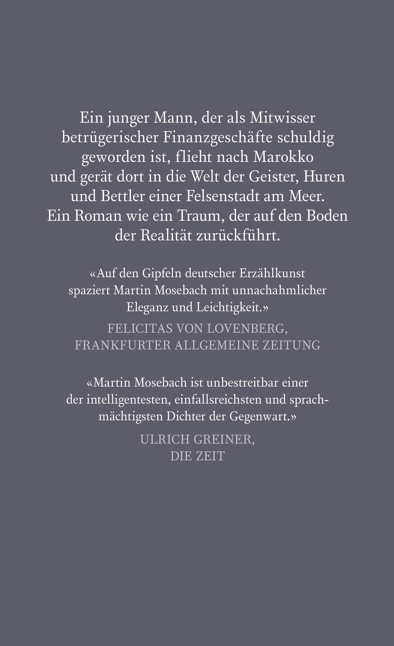 Virtuos inszeniert Martin Mosebach den Zusammenprall der Welten. … So klug, so kenntnisreich und anschaulich wurde in der deutschen Gegenwartsliteratur lange nicht mehr über die arabische Welt geschrieben. Also, lesen Sie Mogador!