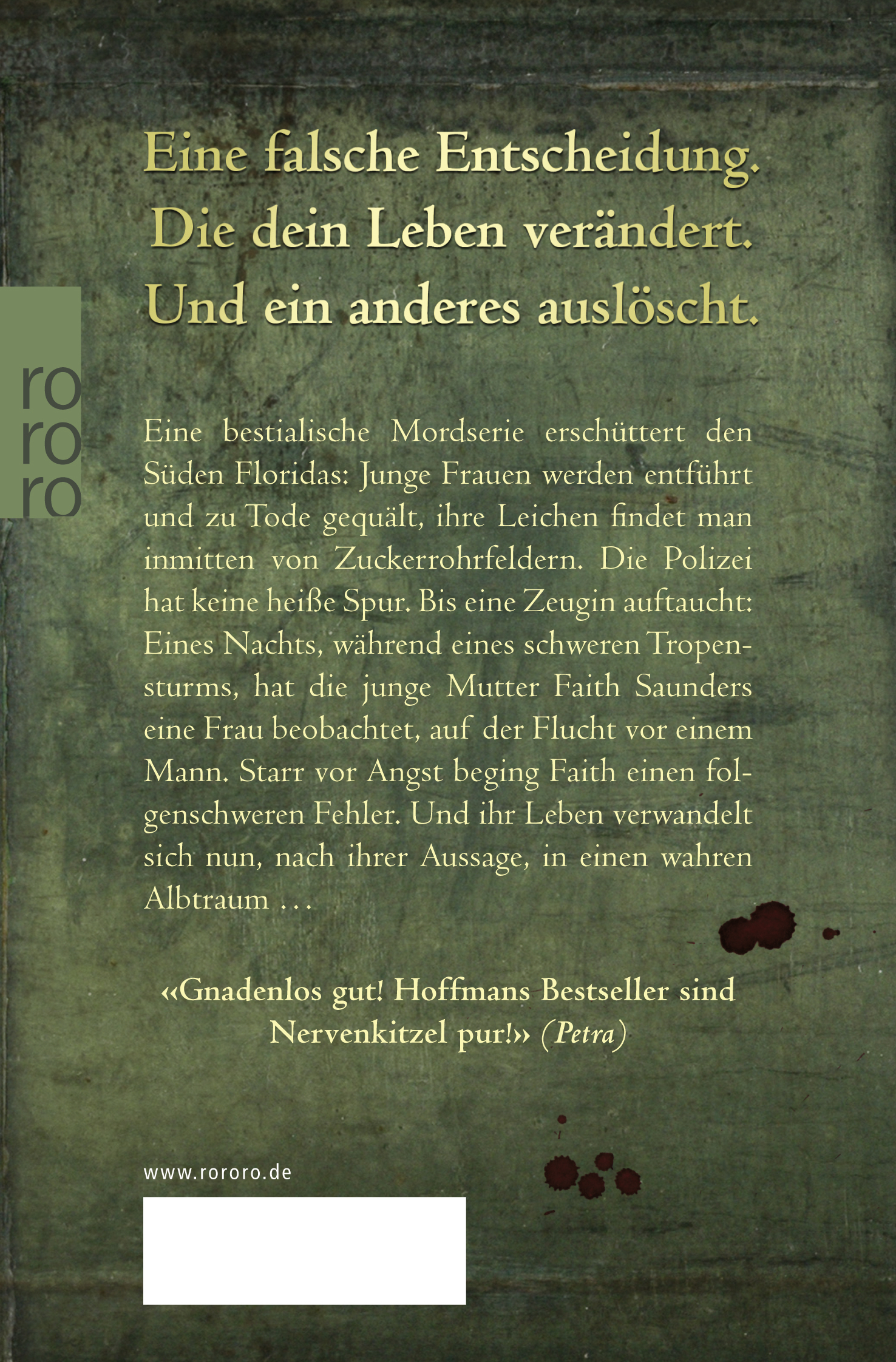 Eine bestialische Mordserie erschüttert den Süden Floridas: Junge Frauen werden entführt und zu Tode gequält, ihre Leichen findet man inmitten von Zuckerrohrfeldern. Die Polizei hat keine heiße Spur. Bis eine Zeugin auftaucht: Eines Nachts, während eines schweren Tropensturms, hat die junge Mutter Faith Saunders eine Frau beobachtet, auf der Flucht vor einem Mann. Starr vor Angst beging Faith einen folgenschweren Fehler. Und ihr Leben verwandelt sich nun, nach ihrer Aussage, in einen wahren Albtraum ...