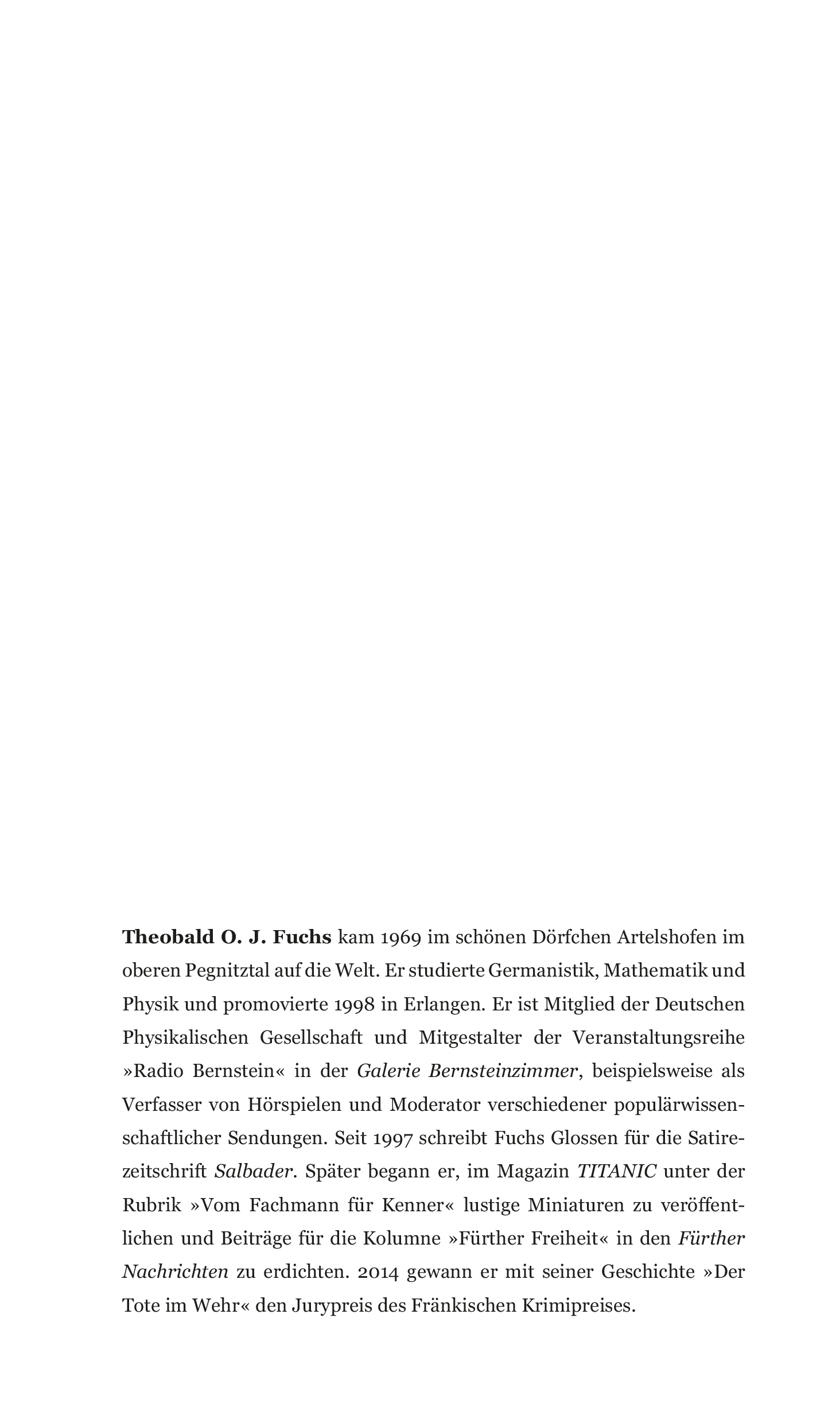 Theobald O. J. Fuchs kam 1969 im schönen Dörfchen Artelshofen im oberen Pegnitztal auf die Welt. Er studierte Germanistik, Mathematik und Physik und promovierte 1998 in Erlangen. Er ist Mitglied der Deutschen Physikalischen Gesellschaft und Mitgestalter der Veranstaltungsreihe Radio Bernstein in der Galerie Bernsteinzimmer, beispielsweise als Verfasser von Hörspielen und Moderator verschiedener populärwissenschaftlicher Sendungen. Seit 1997 schreibt Fuchs Glossen für die Satirezeitschrift Salbader. Später begann er, im Magazin Titanic unter der Rubrik »Vom Fachmann für Kenner« lustige Miniaturen zu veröffentlichen und Beiträge für die Kolumne »Fürther Freiheit« in den Fürther Nachrichten zu erdichten. 2014 gewann er mit seiner Geschichte »Der Tote im Wehr« den Jurypreis des Fränkischen Krimipreises.