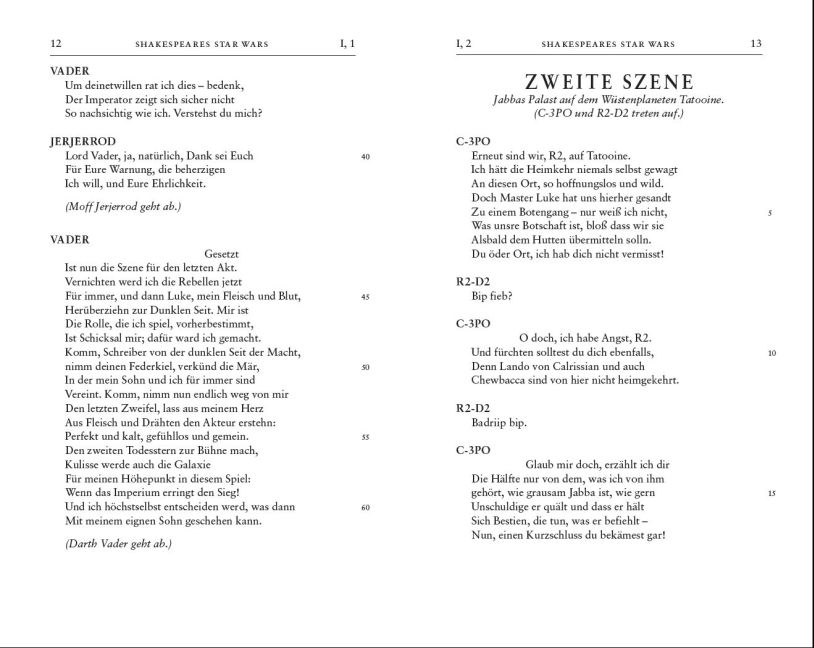 O Freunde, Sterbliche, kommt rein, schaut her, Den Fortgang der Geschichte gleich zu sehn. Luke Skywalker kehrt heim ins Dünenmeer, Lässt Han aus Karbonit bald auferstehn. Nach Fürwahr, eine neue Hoffnung und Das Imperium schlägt zurück ist dies der dritte Band der Star Wars-Shakespeare- Saga und Abschluss der Ur-Trilogie. Für die dramatischen Ereignisse zwischen Darth Vader und seinem Sohn Luke Skywalker scheinen die Stücke Shakespeares Pate gestanden zu haben. Es wirkt daher völlig natürlich und verwundert kaum, dass Vaders Monologe seine Wandlung vom Saulus zum Paulus leichter nachvollziehbar und verständlicher machen. Vader ist fürwahr ein shakespearescher Charakter erster Güte, dessen Entwicklung in diesem Stück seine Vollendung erfährt.