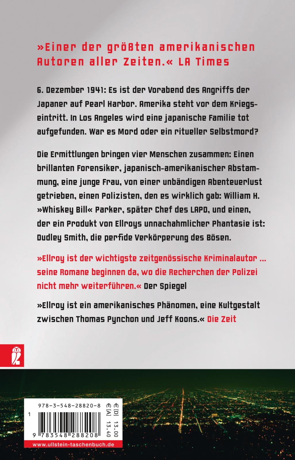 6. Dezember 1941: Es ist der Vorabend des Angriffs der Japaner auf Pearl Harbor. Amerika steht kurz vor dem Kriegseintritt. In Los Angeles wird eine japanische Familie tot aufgefunden. Handelt es sich um Mord oder rituellen Selbstmord? Die Ermittlungen bringen vier Menschen zusammen: Einen brillanten Forensiker, japanischamerikanischer Abstammung, eine junge Frau, von einer unbändigen Abenteuerlust getrieben, einen Polizisten, den es wirklich gab: William H. »Whiskey Bill« Parker, später Chef des LAPD, und einen, der ein Produkt von Ellroys unnachahmlicher Phantasie ist: Dudley Smith, die perfide Verkörperung des Bösen.
