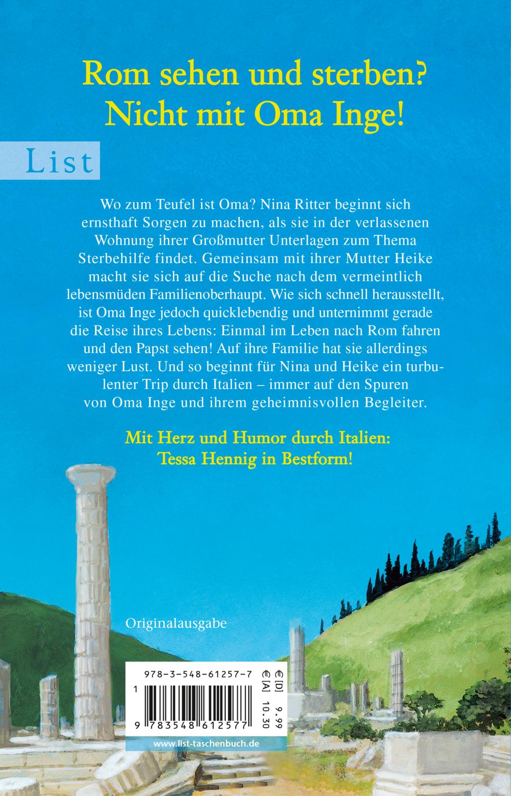 Wo zum Teufel ist Oma? Nina Ritter beginnt sich ernsthaft Sorgen zu machen, als sie in der Wohnung ihrer Großmutter Unterlagen zum Thema Sterbehilfe findet. Gemeinsam mit ihrer Mutter Heike macht sie sich auf die Suche nach dem vermeintlich lebensmüden Familienoberhaupt. Wie sich schnell herausstellt, ist Oma Inge jedoch quicklebendig und unternimmt gerade die Reise ihres Lebens: Einmal im Leben nach Rom fahren und den Papst sehen! Auf ihre Familie hat sie allerdings weniger Lust. Und so beginnt für Nina und Heike ein turbulenter Trip durch Italien - immer auf den Spuren von Oma Inge und ihrem geheimnisvollen Begleiter.