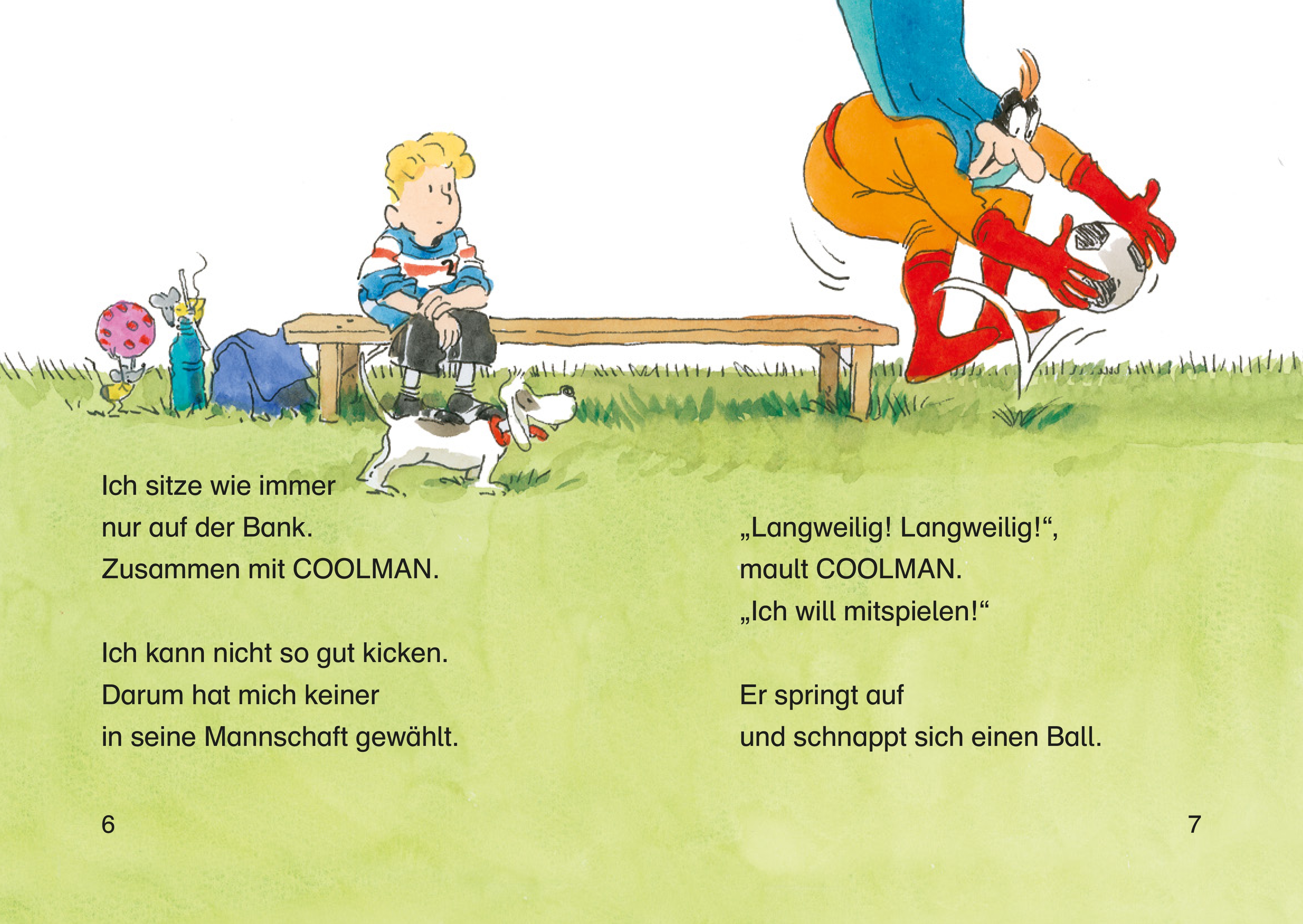 COOLMAN als Fußballexperte: Das kann ja nur im Chaos enden! Kai und seine Klasse spielen im Sportunterricht Fußball. Nicht gerade seine Lieblingsstunde, und dann muss er auch noch auf der Ersatzbank bleiben. Langweilig!, findet COOLMAN und stürmt lieber selbst das Tor. Als Kai dann doch noch mitspielen darf, hat COOLMAN natürlich viele gute Tipps für ihn: Schieß links oben, nein rechts unten, doch lieber links unten. Kai ist ganz durcheinander und kriegt am Ende nur einen Kullerball hin. Da stellt der Lehrer ihn doch lieber ins Tor. Klar, dass COOLMAN genau weiß, wie man einen Ball hält: Einfach das Tor mit Ziegeln zumauern oder den Stürmer in Stein verzaubern! Kai wird so von COOLMAN abgelenkt, dass er jeden Ball reinlässt. COOLMAN geht ihm ganz schön auf die Nerven. Da schnappt er sich selbst den Ball und kann sich am Ende doch noch als Torschütze beweisen.