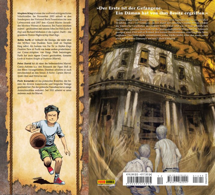 Stephen King ist einer der weltweit erfolgreichsten Schriftsteller. Im November 2003 erhielt er den Sonderpreis der National Book Foundation für sein Lebenswerk und 2007 den »Grand Master Award« der Mystery Writers of America. Bei Panini erschien zuletzt – geschrieben mit seinem Sohn Joe Hill (Locke & Key) und Richard Matheson (I Am Legend, Duell) – der grandiose Horror-Highwaytrip Road Rage. Robin Furth ist vielleicht die Einzige, die mehr über den Mythos vom Dunklen Turm weiß als Stephen King selbst. Als Autorin von Das Tor zu Stephen Kings Dunklem Turm ist Furth wie keine andere prädestiniert, zur Comic-Adaption von Kings Werk beizutragen. Furth hat auch eigene Comics geschrieben, darunter Lords of Avalon: Knight of Darkness (Marvel). Peter David hat als einer der bedeutendsten Marvel-Comic-Autoren u.a. den Relaunch der Figur Hulk in den 80ern vorangetrieben. Daneben arbeitete er auch entscheidend an den Serien X-Factor, Captain Marvel, Spider-Man und Wolverine mit. Piotr Kowalski ist ein polnischer Künstler, der bereits für diverse französische und belgische Verlage gearbeitet hat. Für das polnische Fernsehen hat er einige Animationsfi lme realisiert. Seit 2011 arbeitet er unter anderem auch für Marvel.