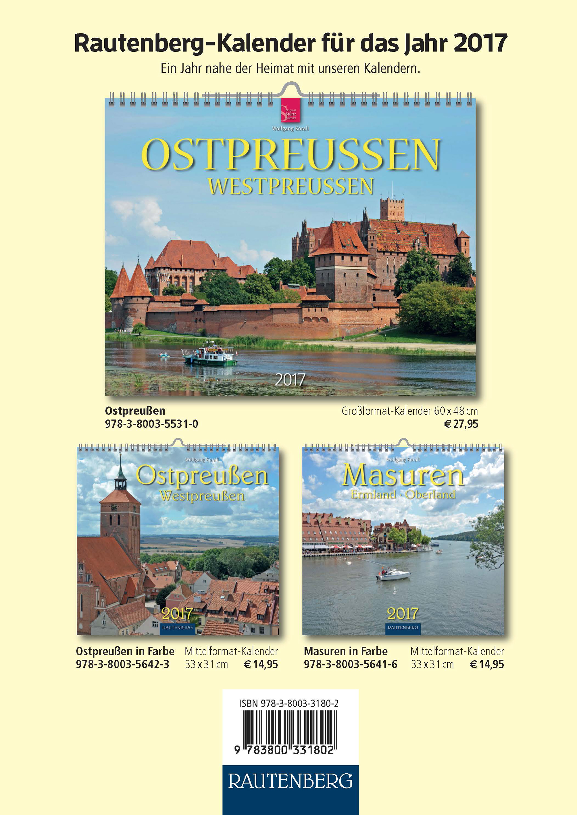 | Schlagworte | Agnes Miegel • Allenstein • Anekdoten • Baltikum • Buch-Kalender • Elbing • Gumbinnen • Insterburg • Kalender • Kalenderbuch • Kalenderbuch 2017 • Kalender Ostpreußen 2017 • Königsberg • Kurische Nehrung • Kurisches Haff • Masuren • Memel • Memelland • Nidden • Ostpreußen • Ostpreußen 2017 • Ostpreußen (Kalender) • Ostpreußen Kalender 2017 • Ostpreußen Literatur • Ostpreußische Geschichten • Ostpreußische Künstler • Ostpreußische Kurzgeschichten • ostpreußische Literatur • Ostpreußischer Taschenkalender • Ostpreußischer Terminkalender • Prussen • Rastenburg • Ruth Geede • Samland • Taschenkalender Ostpreußen • Termin-Kalender • Terminkalender Ostpreußen |