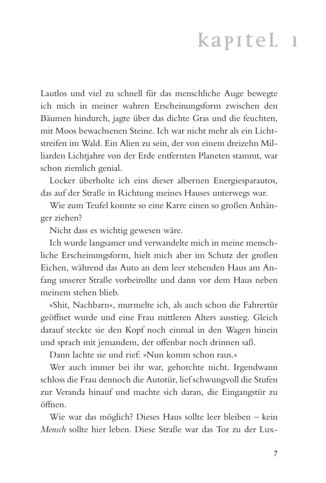 Als Katy nebenan einzieht, weiß Daemon sofort: Das gibt Schwierigkeiten. Er darf keinen Menschen an sich heranlassen, denn das würde Fragen aufwerfen. Warum bist du so stark? Wie kannst du dich so schnell bewegen? Was BIST du? Die Antwort darauf ist ein Geheimnis, das niemals gelüftet werden darf. Doch Katy bringt Daemon vom ersten Tag an aus der Fassung. Er will ihr nahe sein, aber diese Schwäche kann er sich nicht erlauben. Sich in Katy zu verlieben würde nicht nur sie in Gefahr bringen – es könnte auch das Ende der Lux bedeuten.