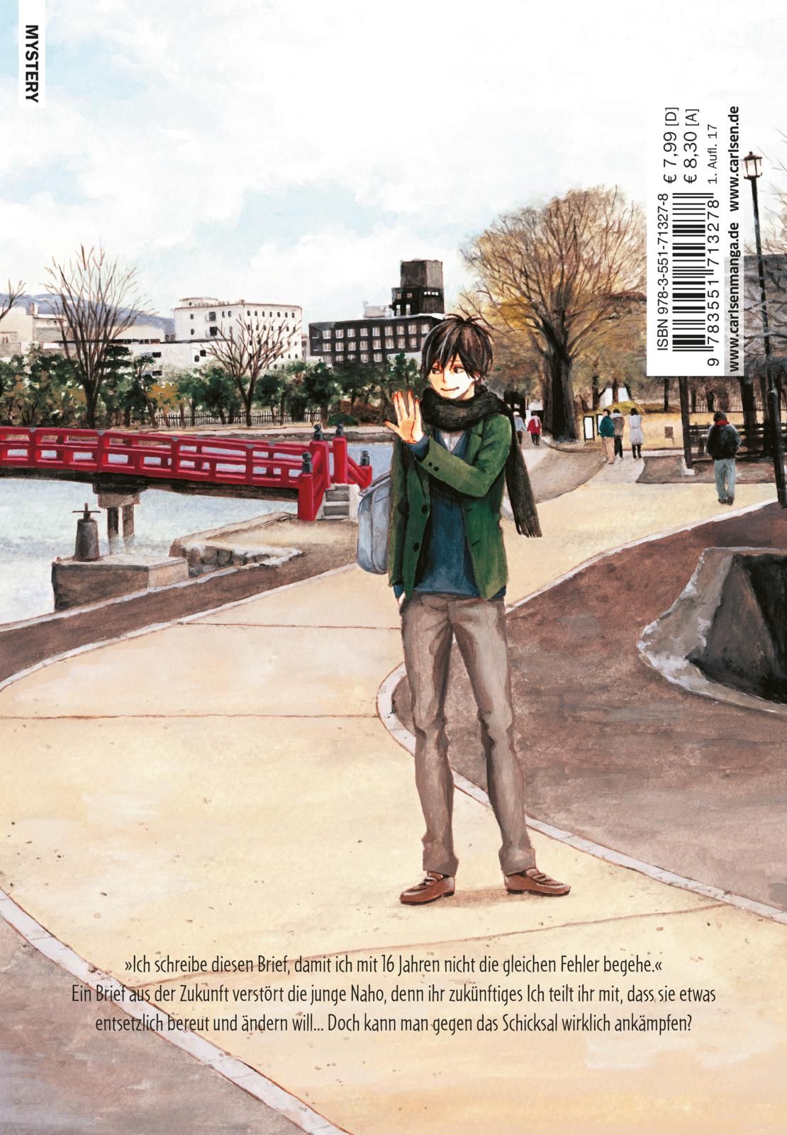 "Liebe Naho..." ... nicht ungewöhnlich, dass ein Brief an Naho mit dieser Anrede beginnt. Aber da will doch jemand tatsächlich Naho Takamiya weismachen, dass ihr zukünftiges Ich sich selbst diesen Brief geschrieben haben soll!! Ein Brief aus der Zukunft?! Naho glaubt das natürlich erst nicht, doch dann geschehen die Dinge wirklich so, wie sie in dem Brief beschrieben wurden. Etwas Schlimmes scheint sich in ihrem Leben heranzubahnen, und sie beschließt, das Schicksal zu ändern... Mit Gratis-Postkarte als Beilage, nur in der 1. Auflage!