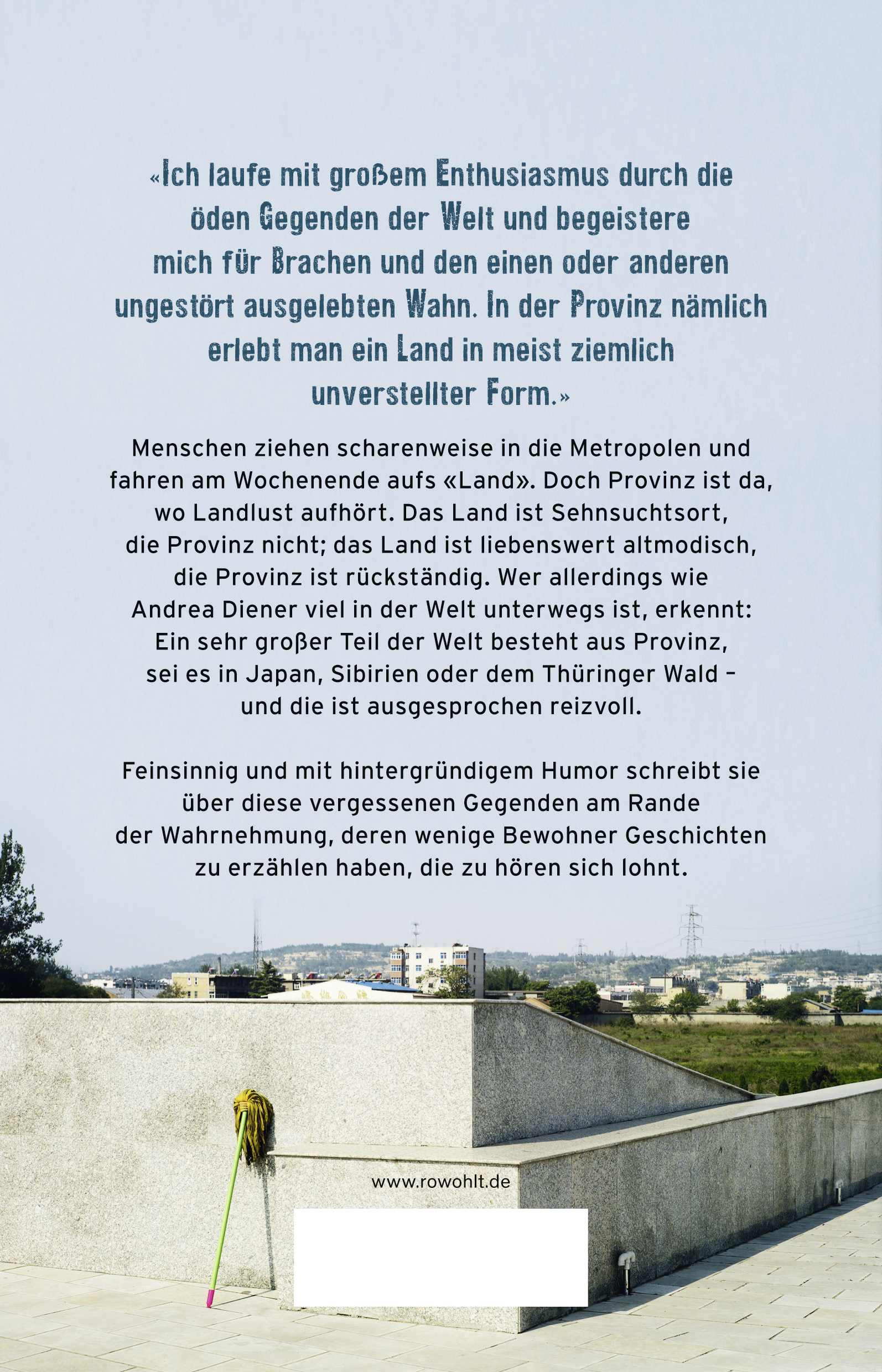 Menschen ziehen scharenweise in die Metropolen und fahren am Wochenende aufs «Land». Doch Provinz ist da, wo Landlust aufhört. Das Land ist Sehnsuchtsort, die Provinz nicht; das Land ist liebenswert altmodisch, die Provinz ist rückständig. Wer allerdings wie Andrea Diener viel in der Welt unterwegs ist, erkennt: Ein sehr großer Teil der Welt besteht aus Provinz, sei es in Japan, Sibirien oder dem Thüringer Wald – und die ist ausgesprochen reizvoll.