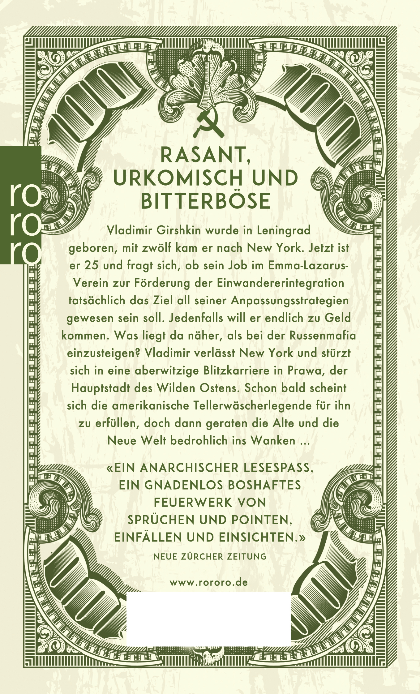Vladimir Girshkin wurde in Leningrad geboren, mit zwölf kam er nach New York. Jetzt ist er 25 und fragt sich, ob sein Job im Emma-Lazarus-Verein zur Förderung der Einwandererintegration tatsächlich das Ziel all seiner Anpassungsstrategien gewesen sein soll. Jedenfalls will er endlich zu Geld kommen. Was liegt da näher, als bei der Russenmafia einzusteigen? Vladimir verlässt New York und stürzt sich in eine aberwitzige Blitzkarriere in Prawa, der Hauptstadt des Wilden Ostens. Schon bald scheint sich die amerikanische Tellerwäscherlegende für ihn zu erfüllen, doch dann geraten die Alte und die Neue Welt bedrohlich ins Wanken ...