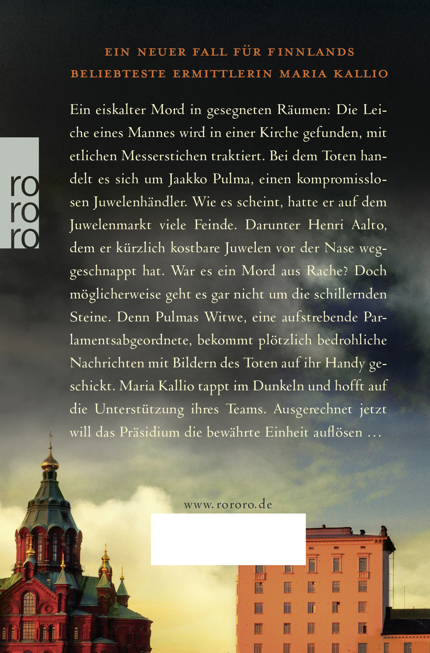 Ein eiskalter Mord in gesegneten Räumen: Die Leiche eines Mannes wird in einer Kirche gefunden, mit etlichen Messerstichen traktiert. Bei dem Toten handelt es sich um Jaakko Pulma, einem kompromisslosen Juwelenhändler. Wie es scheint, hatte er auf dem Juwelenmarkt viele Feinde. Darunter Henri Aalto, dem er kürzlich kostbare Juwelen vor der Nase weggeschnappt hat. War es ein Mord aus Rache? Doch möglicherweise geht es gar nicht um die schillernden Steine. Denn Pulmas Witwe, eine aufstrebende Parlamentsabgeordnete, bekommt plötzlich bedrohliche Nachrichten mit Bildern des Toten auf ihr Handy geschickt. Maria Kallio tappt im Dunkeln und hofft auf die Unterstützung ihres Teams. Ausgerechnet jetzt will das Präsidium die bewährte Einheit auflösen...